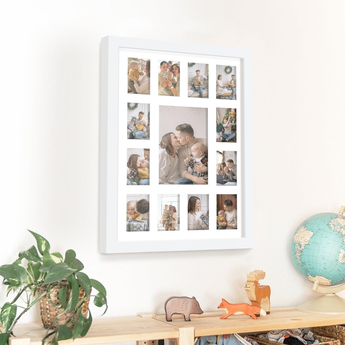 ?Frame Size?: 12 x 16 School Photo Insert: 2 x 3; Center Photo Insert: 4.5 x 6.5 | ?Material?: This newborn photo frame helps you record your newborns monthly growth and changes. Safe and transparent plexiglass is added to a durable MDF frame to protect your childs photos, which is worth remembering and recalling your childs newborn time. | ?Baby Room Decoration?: This white photo frame features 13 open image frames and attached paintings can be readily displayed. New milestone photos are added every month. | ?Desktop and Wall Display?: Our baby photo frame is more than just a photo frame; its a versatile decorative piece. It can be readily displayed on any bookshelf, desk, or desktop. The durable and lightweight design makes it easy to hang or display on your desktop, allowing you to display your babys journey in various environments. | ?Perfect Baby Gift?: The baby photo frame is an excellent choice for your babys room. It is a perfect gift and keepsake for newborns and a wonderful gift for expectant mothers and friends.
