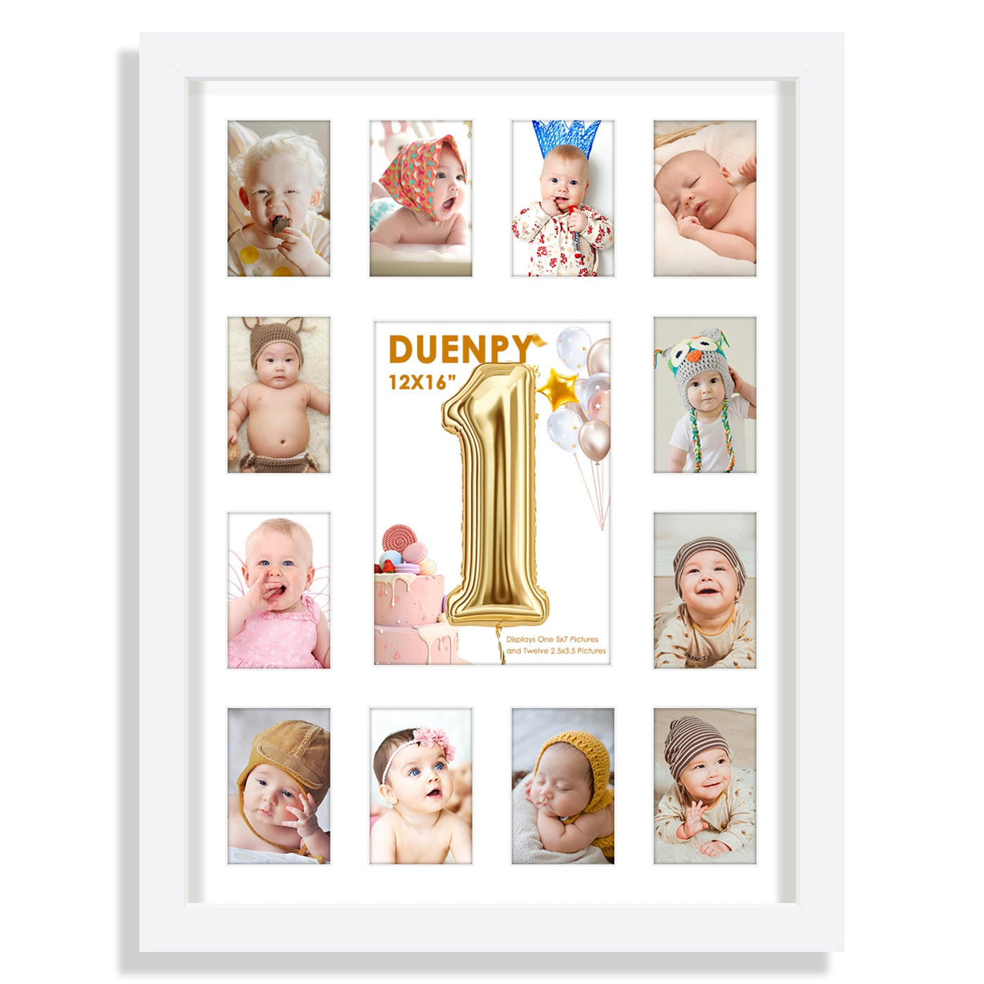 DUENPY 12x16 My First Year Picture Frame Displays One 5x7 inch and Twelve 2x3 inch Small Photo Collage Wall Hanging or Tabletop