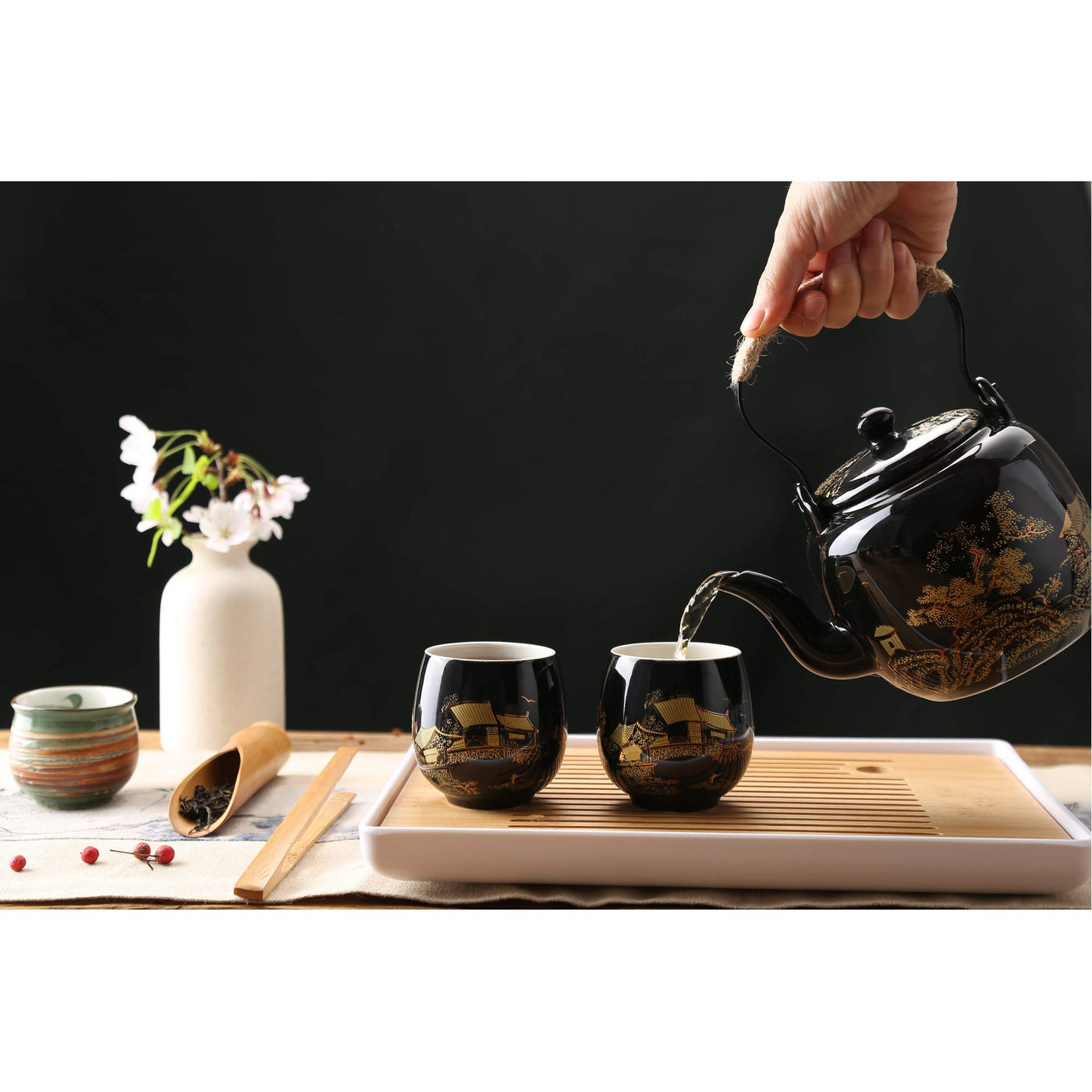 - Q: What is the significance of the design on the tea set? A: The design features a serene depiction of the traditional Japanese countryside, which adds a touch of elegance and reflects a longing for pastoral life.