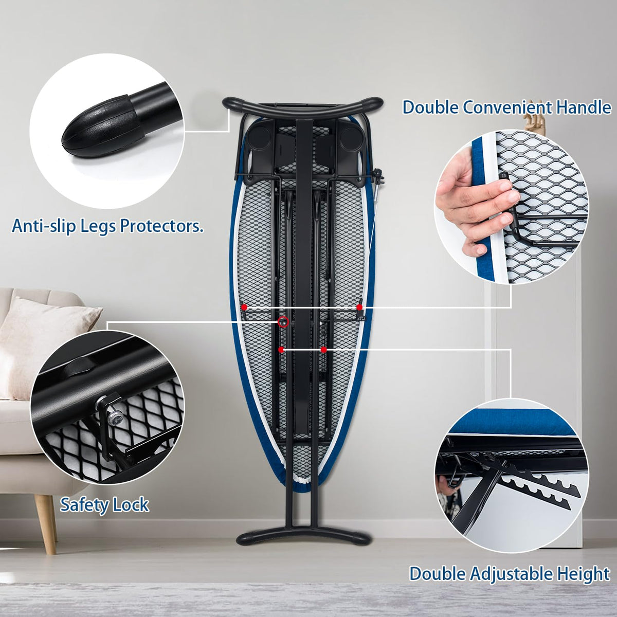 - Q: What safety features does this ironing board have? A: The ironing board includes protective caps on the legs to prevent scratches on floors and a locking mechanism to prevent accidental collapse during use.