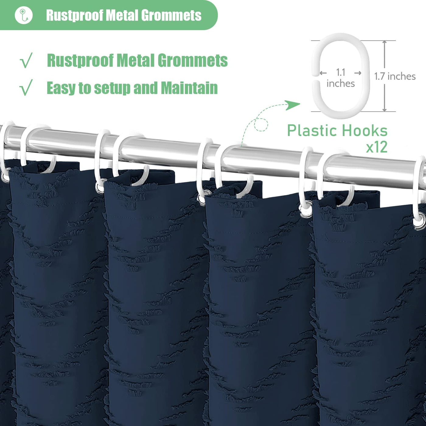 - Q: What style of decor is this shower curtain suitable for? A: The navy blue fabric with tufted chevron stripes makes it suitable for various decor styles, including modern farmhouse, contemporary, bohemian, and shabby chic.