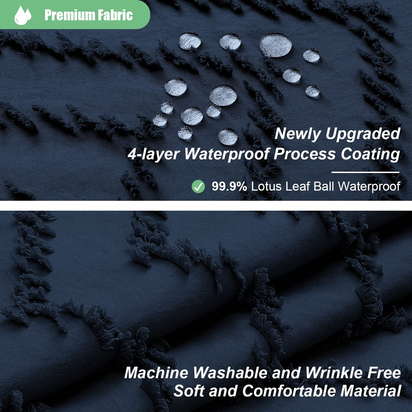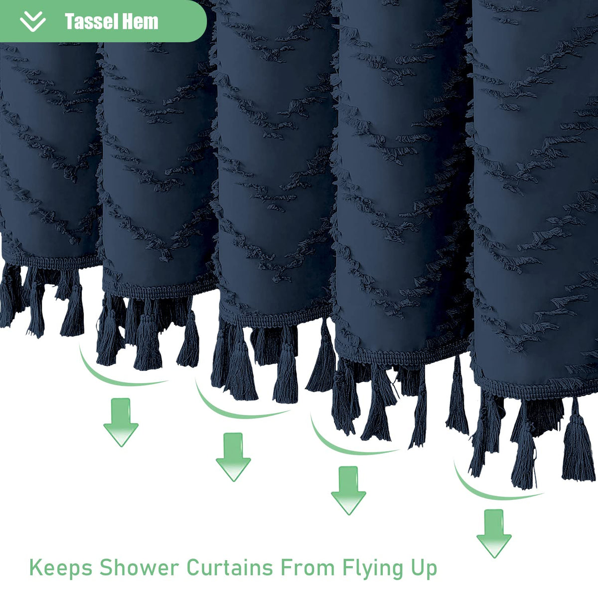 Dynamene Boho Farmhouse Shower Curtain, Navy Blue Fabric Tufted Chevron Striped Textured Tassel Shower Curtains For Bathroom, Wa