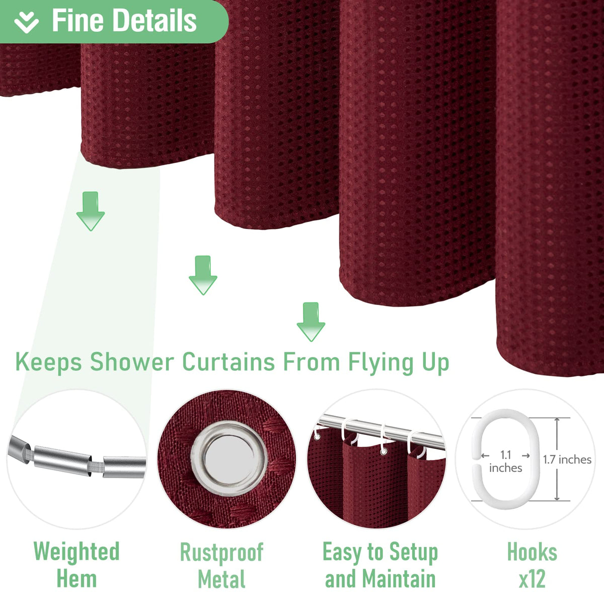 - Q: Does the shower curtain come with hooks? A: Yes, the package includes 12 plastic hooks for easy installation.