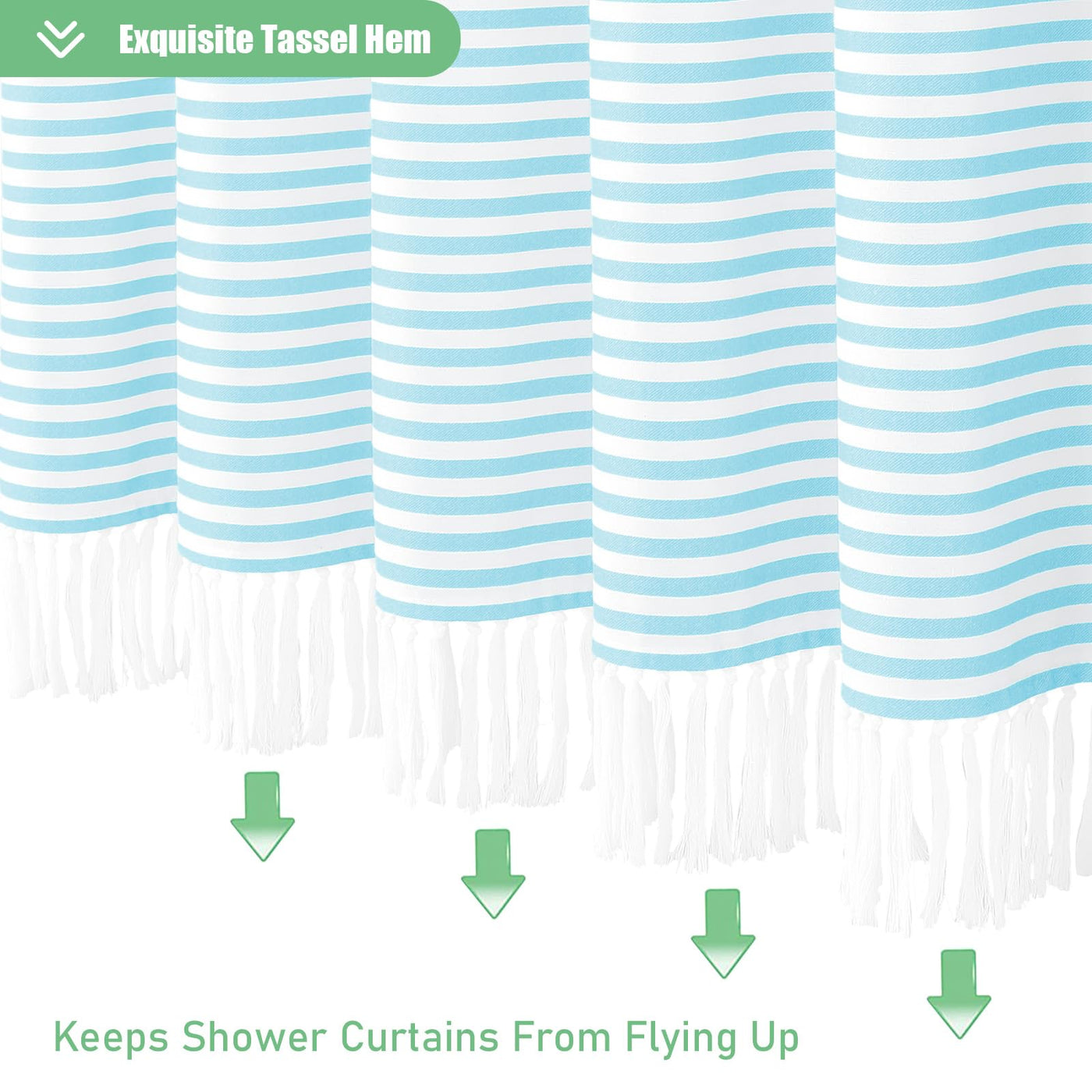 Dynamene Light Blue Fabric Shower Curtain, Farmhouse Boho Striped Tassel Shower Curtain For Bathroom, Bohemian Textured Cloth Sh