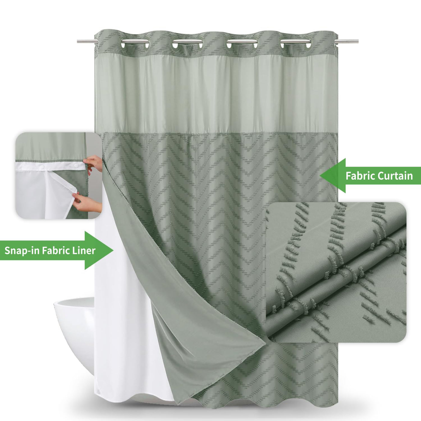 Eachope Long No Hook Tufted Chevron Striped Shower Curtain With Snap-In Fabric Liner Set-71Wx80H(78H),Sage Green Hotel Grade Boh