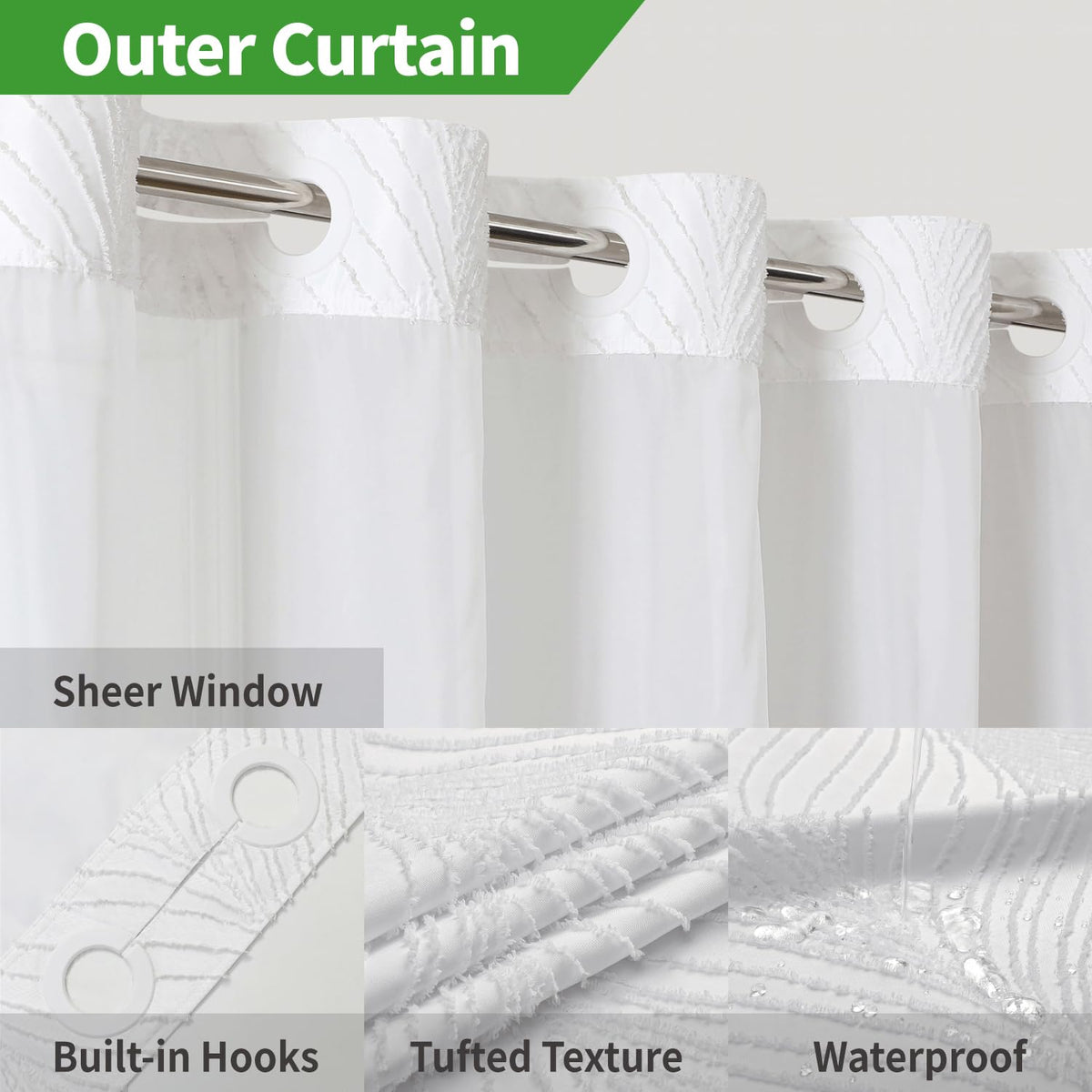 - Q: What features enhance the curtain's stability? A: The snap-on liner includes two magnets at the bottom corners to enhance stability and prevent splashing.