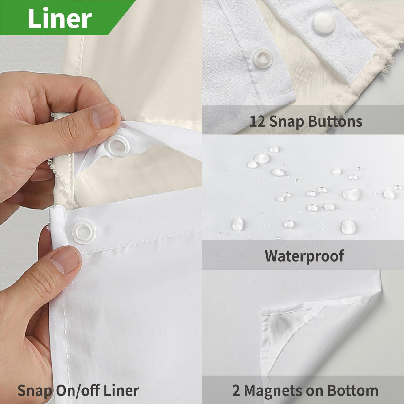 - Q: What are the dimensions of the shower curtain and liner? A: The shower curtain measures 71 inches wide by 80 inches long, while the snap-in liner measures 70 inches wide by 60 inches long.