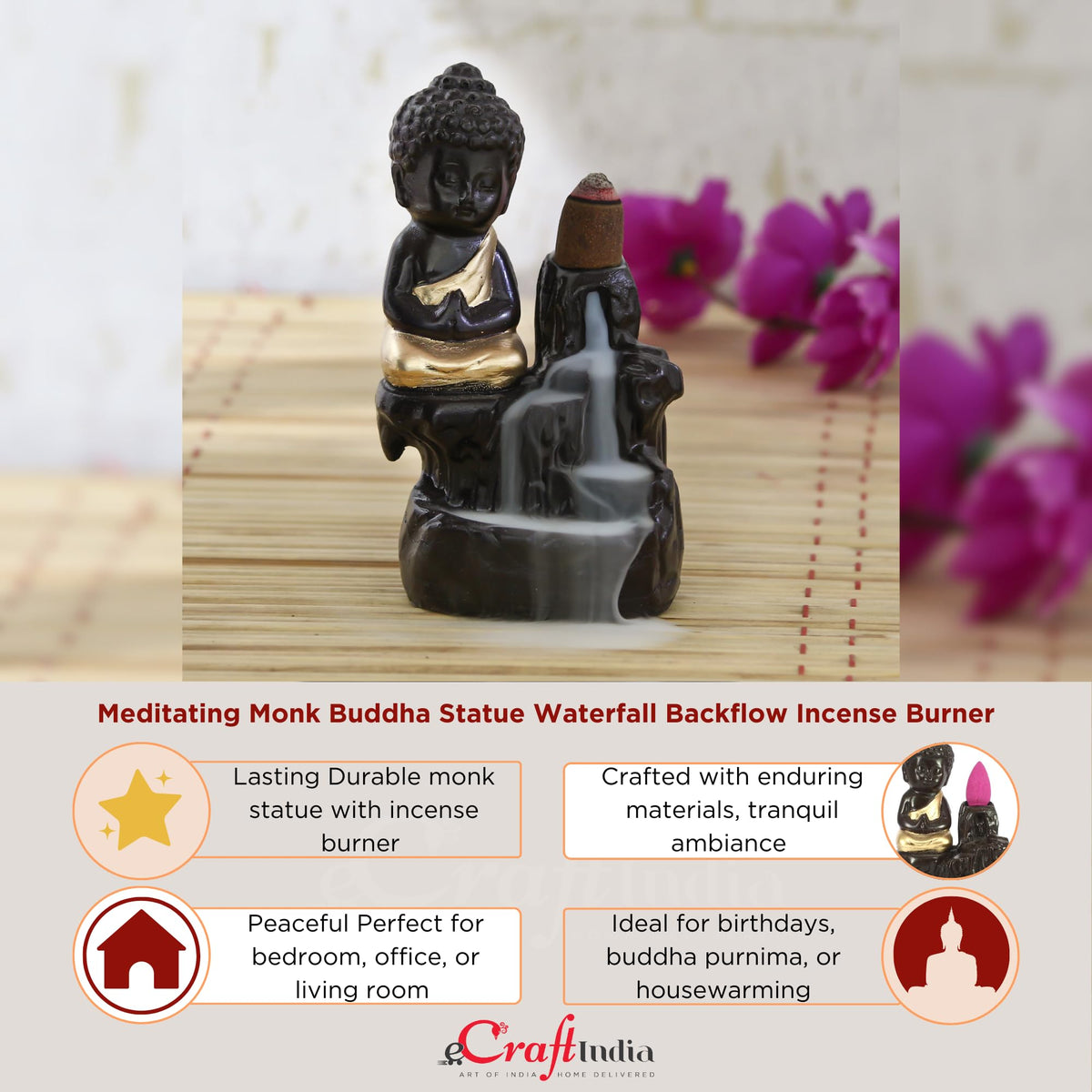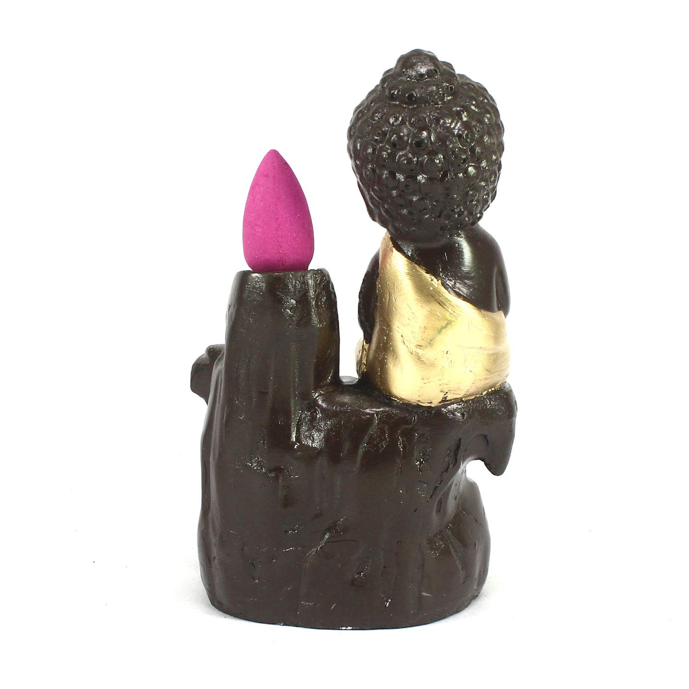 eCraftIndia Black Golden Meditating Monk Buddha Statue Smoke Backflow Incense Holder with Incense Cones Showpiece for Home Decor