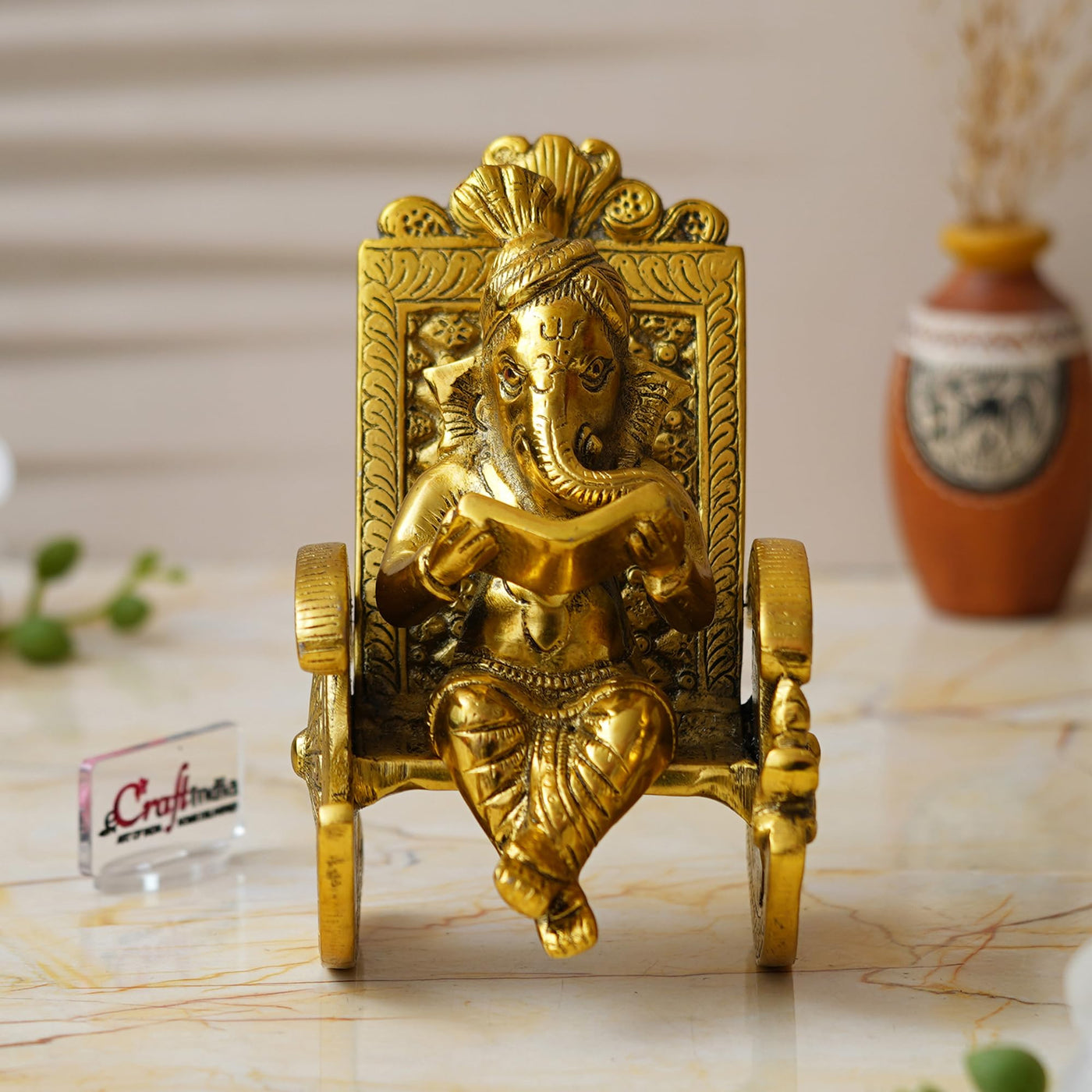 Embark On A Journey Of Wisdom With The Golden Metal Handcrafted Lord Ganesha Idol Reading Book On Rocking Chair By Ecraftindia. Skillfully Crafted From Durable Metal, This Unique Idol Portrays Lord Ganesha Immersed In Knowledge While Seated On A Rocking Chair, Symbolizing Intellect And Prosperity. Ideal Gift For Diwali, Ganesha Chaturthi Or Housewarming, It Brings Blessings And Positivity To Any Home. Whether Placed In The Study Room, Living Room, Or Home Mandir, This Handcrafted God Idol Serves As A Reminder Of The Pursuit Of Knowledge And Divine Guidance In Everyday Life.