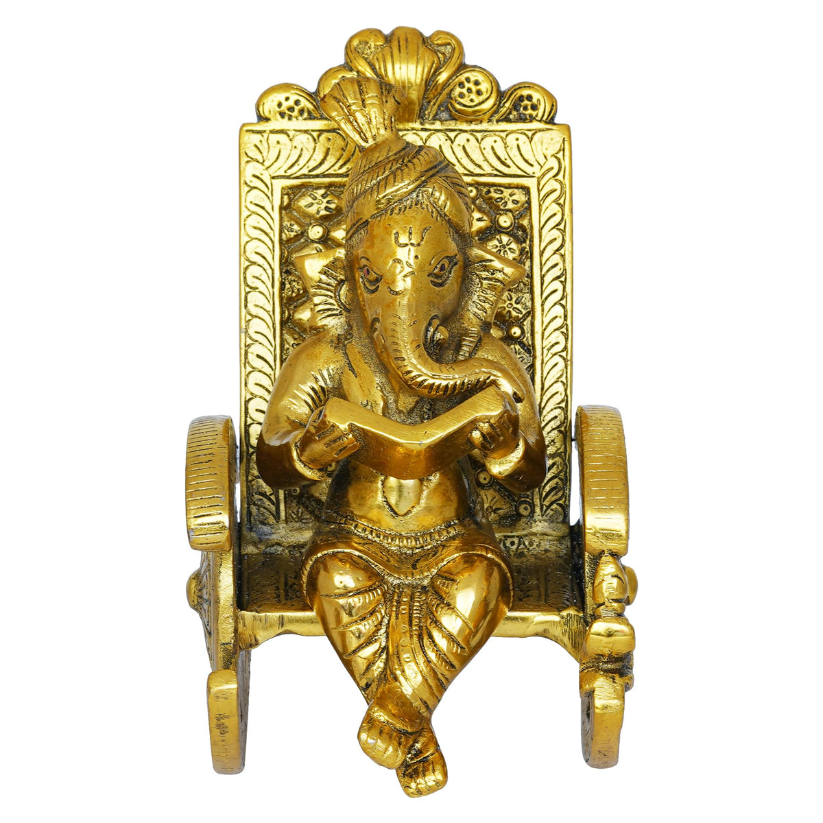 Ecraftindia Golden Metal Handcrafted Lord Ganesha Idol Reading Book On Rocking Chair - God Idol For Home Decor, Office Desk, And