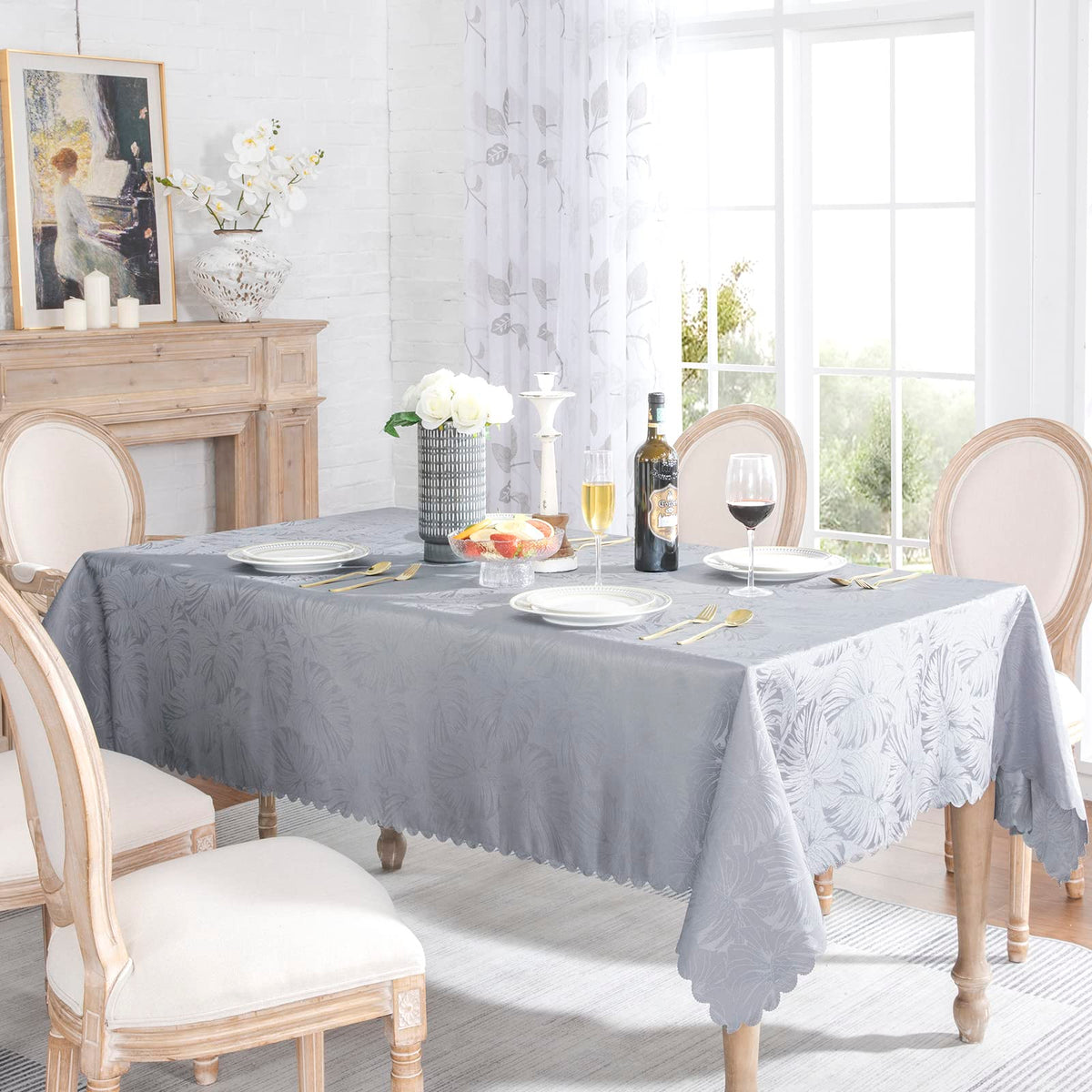 • Q: What design does the tablecloth feature? A: The tablecloth features a classic leaves pattern with scalloped edges, inspired by a natural and efficient home aesthetic.
