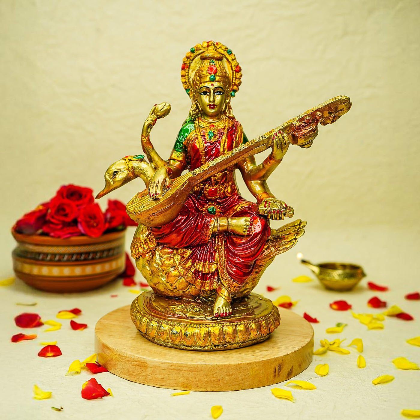Ekhasa Hand Painted Maa Saraswati Idol (8 Inch) | Gold Marble Dust Saraswati Maa Murti For Study Table, Pooja, Home | Resin Saraswathi Devi Pital Idol | Colorful Saraswati Statue For Gifting