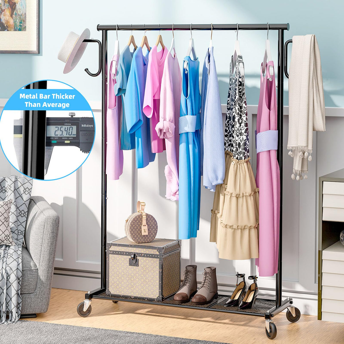 Ekisemio Clothing Garment Rack On Wheels, Heavy Duty Clothes Organizer With Bottom Mesh Shelf For Hanging Clothes, Side With 2 H