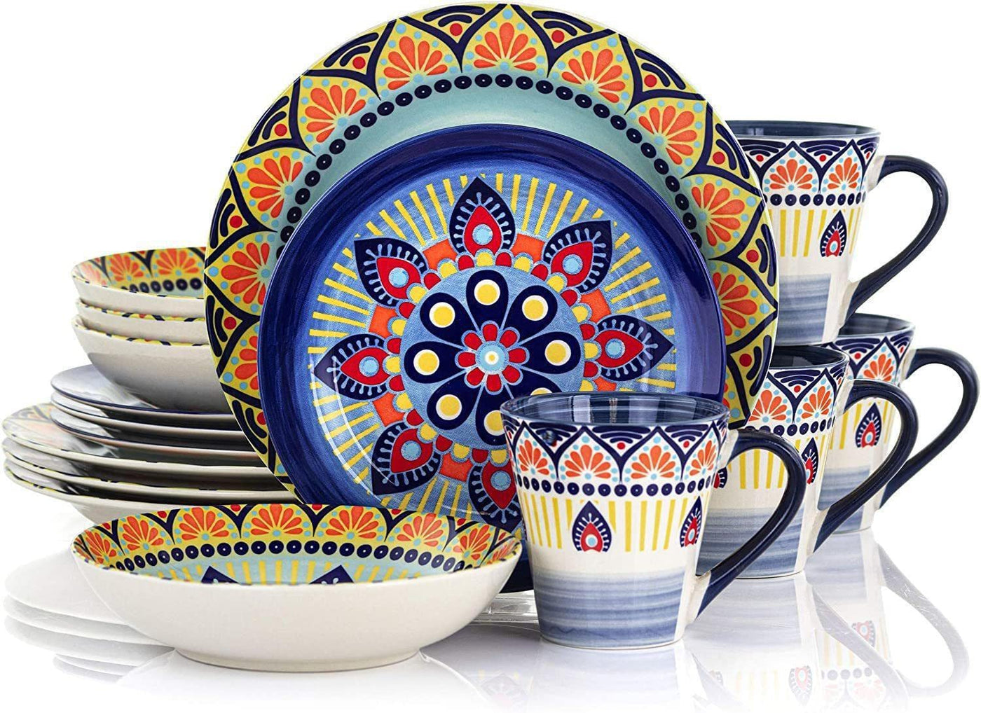 Elama Multicolored Round Stoneware Mandala Pattern Dinnerware Set, 16 Piece, Blue