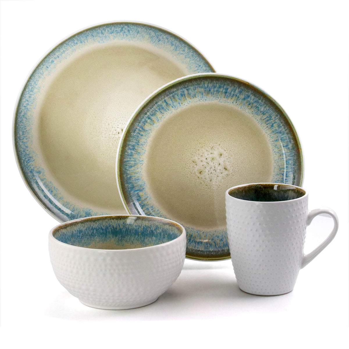 Elama Round Stoneware Contemporary Dinnerware Dish Set, 16 Piece, Warm Taupe with Blue Trim