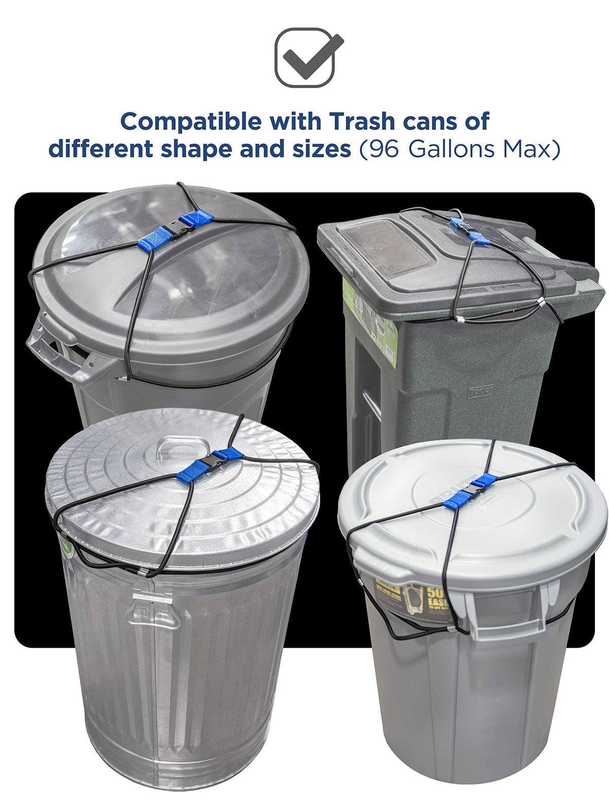 - Q: What size trash cans does this lock fit? A: This trash can lock fits outdoor trash cans that range from 50 to 96 gallons, accommodating both round and square designs.