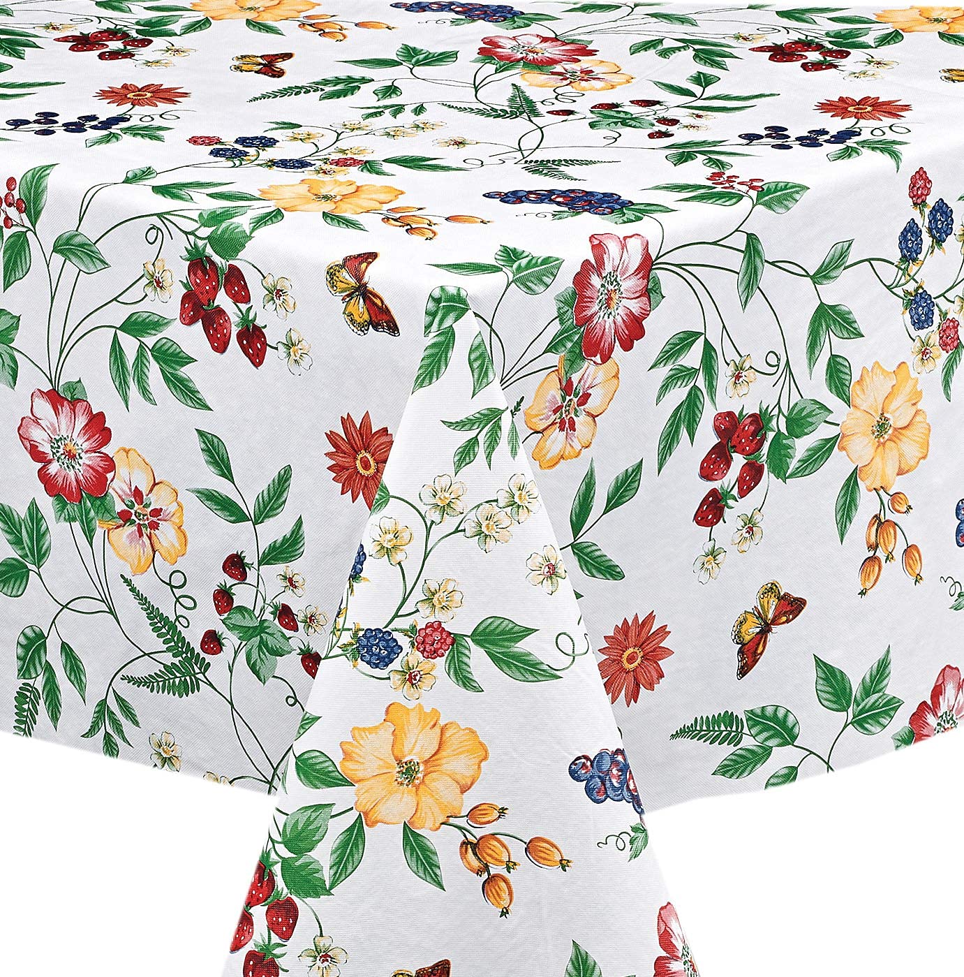 - Q: What colors and patterns are available for this tablecloth? A: The tablecloth features a vibrant berry and floral pattern with bright red strawberries, blueberries, grapes, and multicolored garden flowers on a white background.