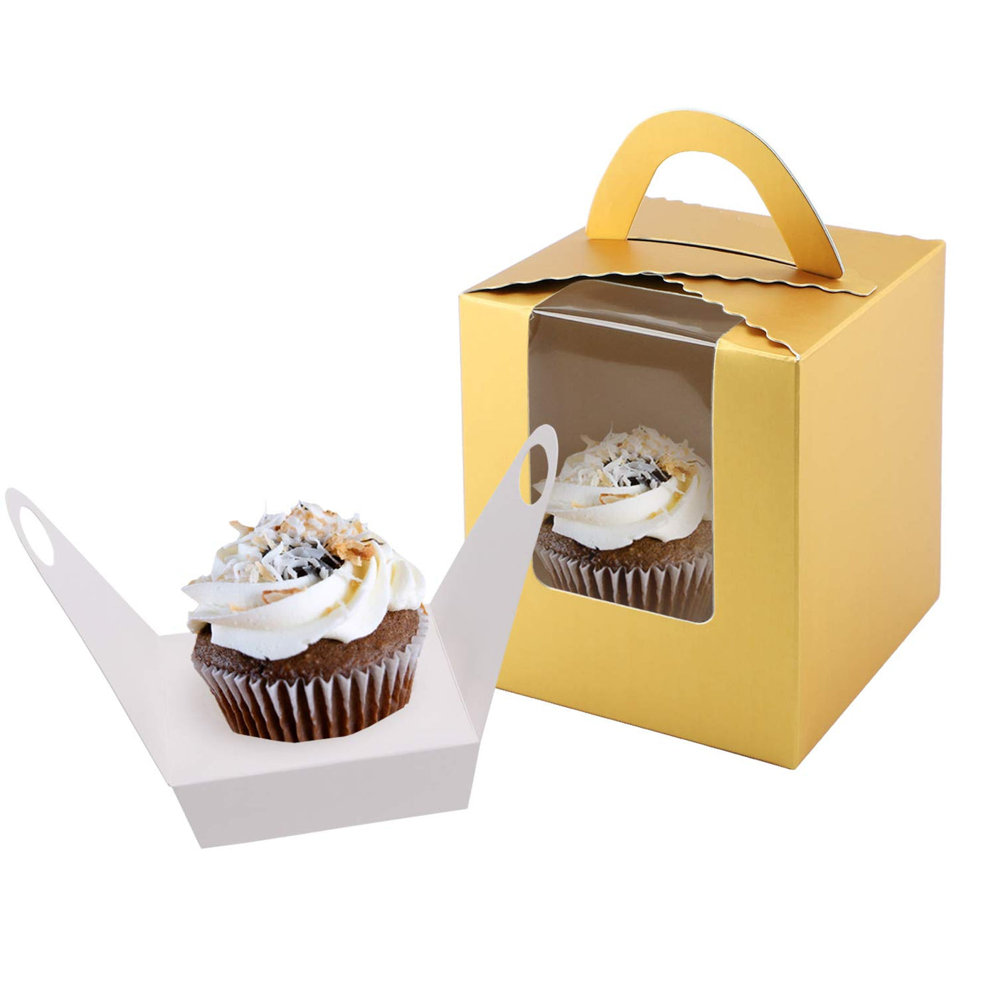 EUSOAR Gold Individual Cupcake Carriers 50pcs 3.6''x 3.6''x 4.3'' Single Disposable Paper Cupcake Boxes Cupcake to go Gift Boxes with Window Handle for Wedding Birthday Party Candy Favor Treats Boxes