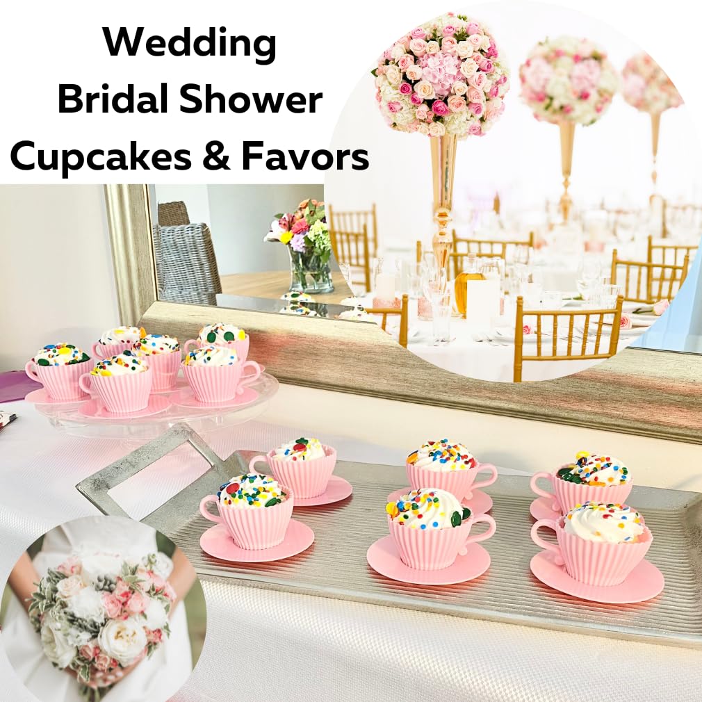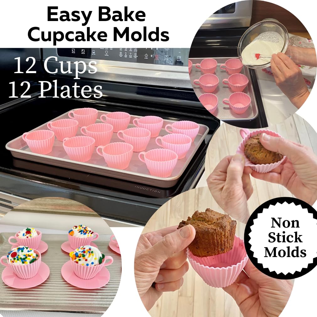 Evelots Teacup Silicone Cupcake Liners For Baking 24 Pc Set Oven Safe Non Stick (12 Cups & 12 Saucers) Reusable Baking Muffin Cu