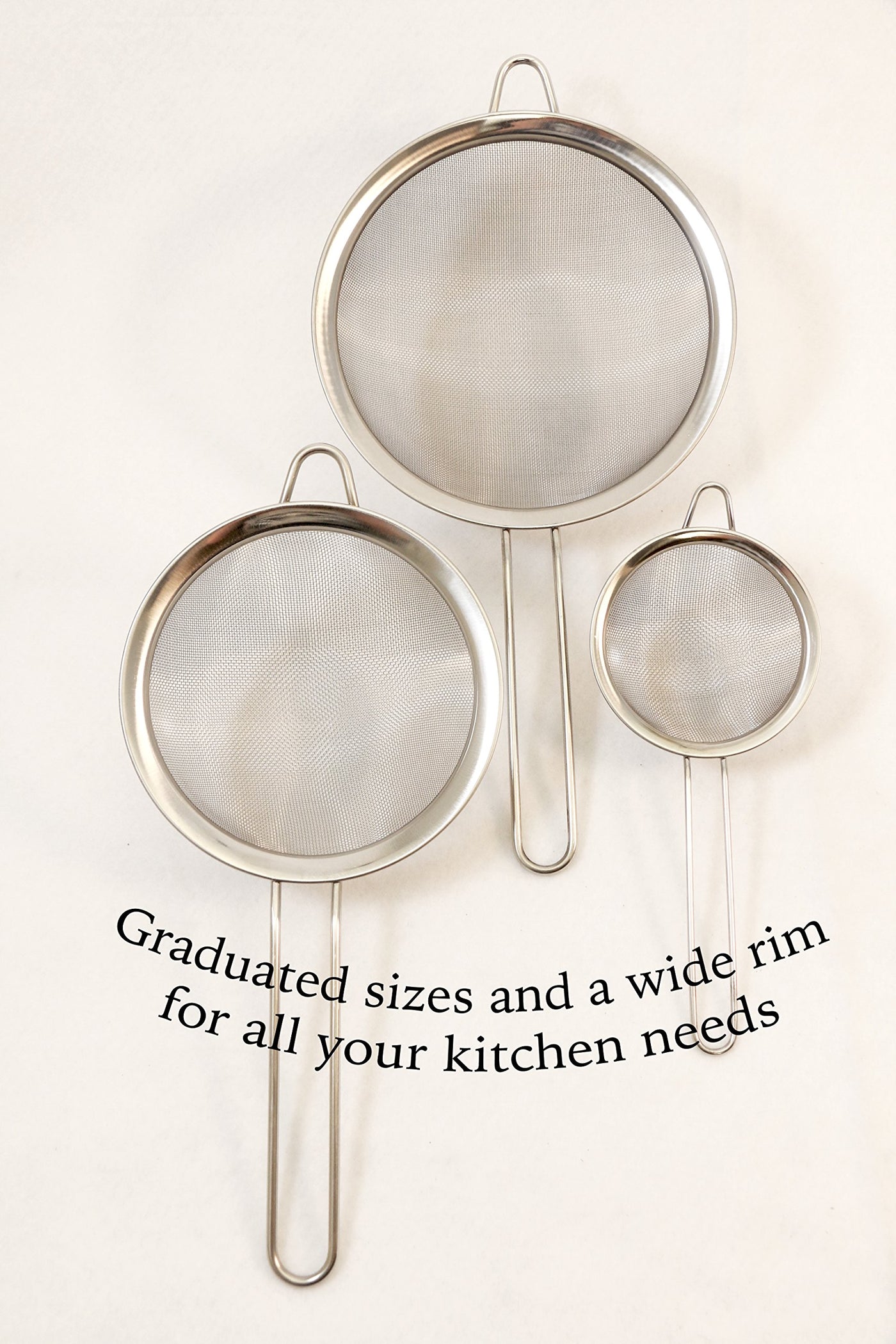 • Q: Can these strainers be used for different kitchen needs? A: Yes, the graduated sizes and wide rims make these strainers perfect for a variety of kitchen needs.