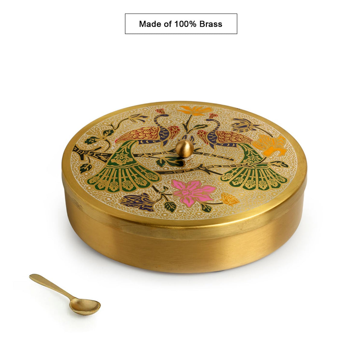 ExclusiveLane Peacock Hand-Etched Brass Masala Box For Kitchen Spice Box With Spoon (Brass, 7 Containers, 110 ML) | Handpainte