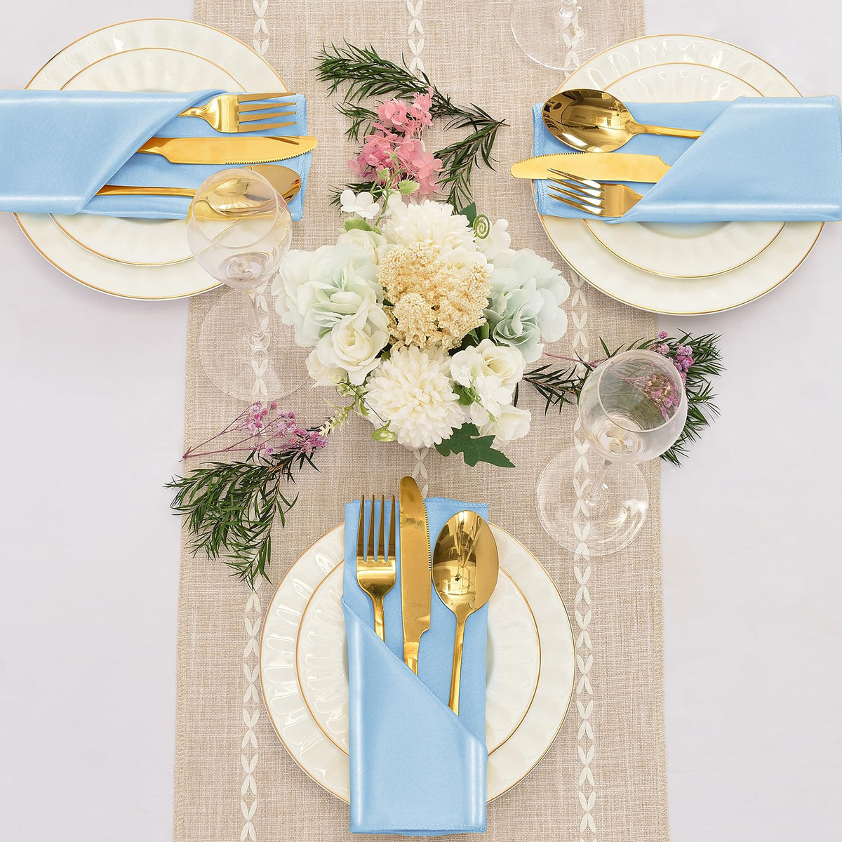 - Q: Do the napkins come in different colors? A: This specific pack features light blue satin napkins, but other colors may be available from the seller.