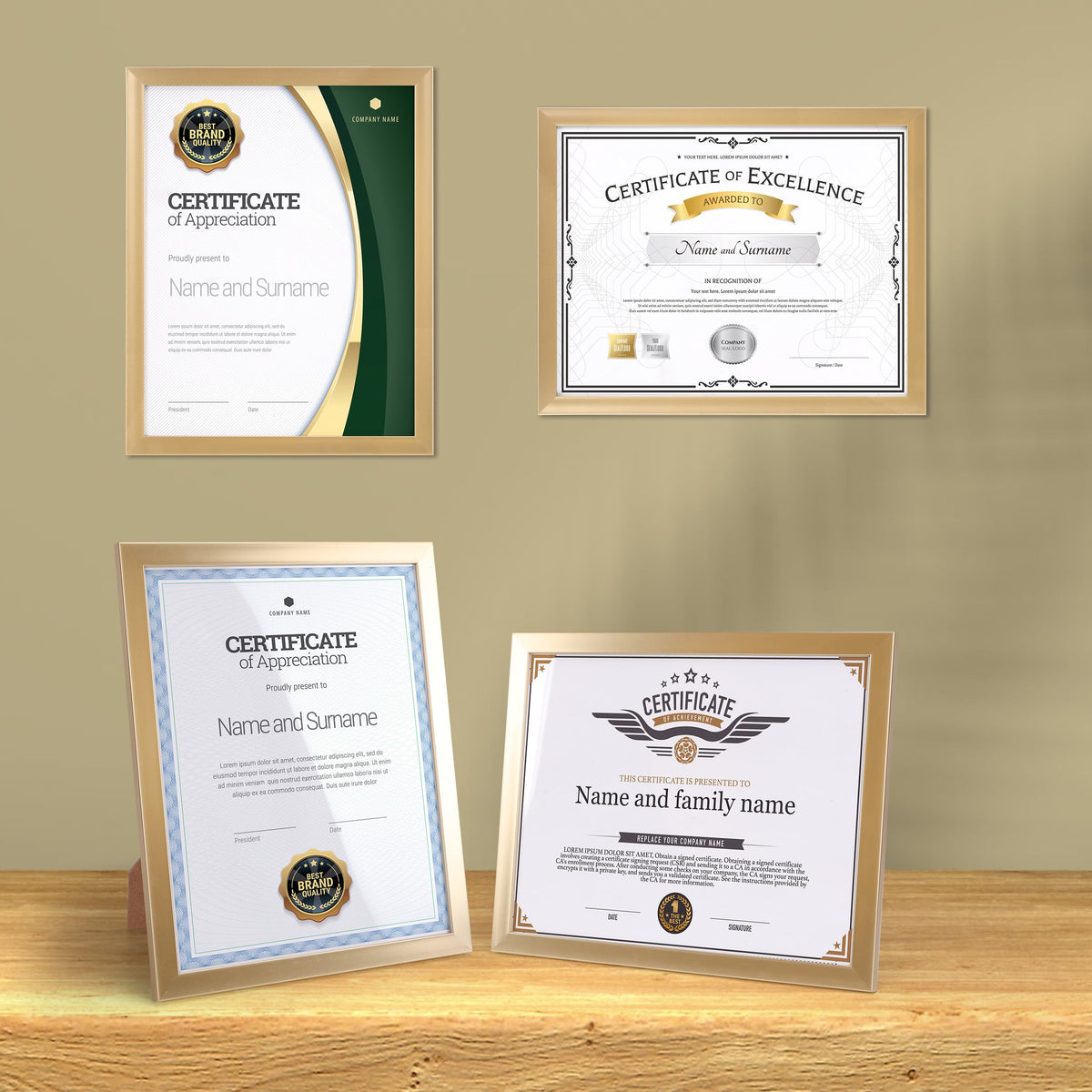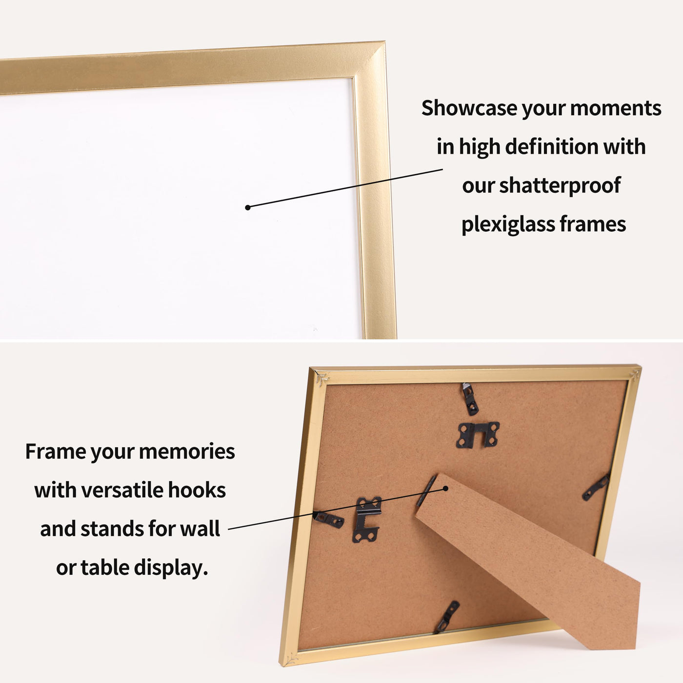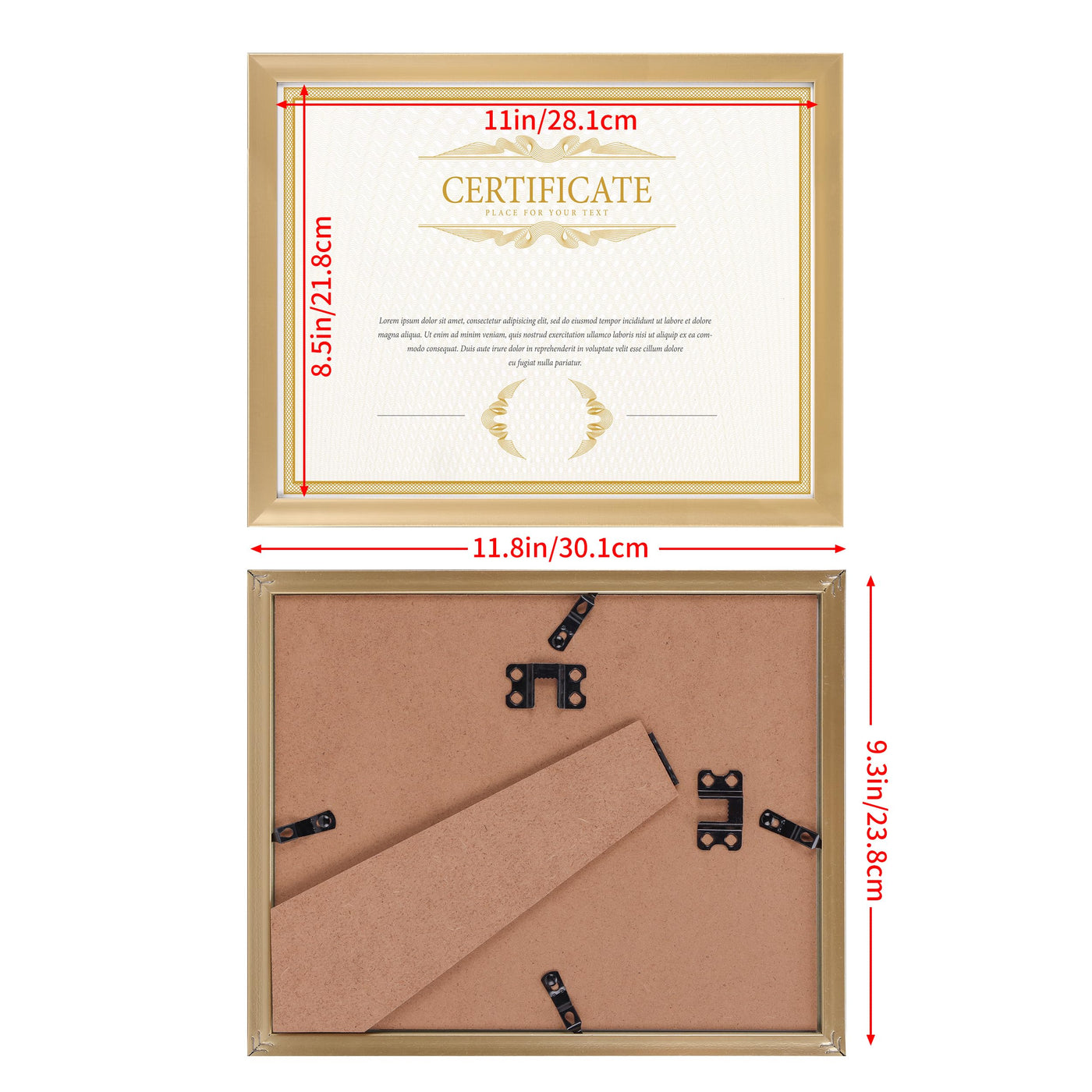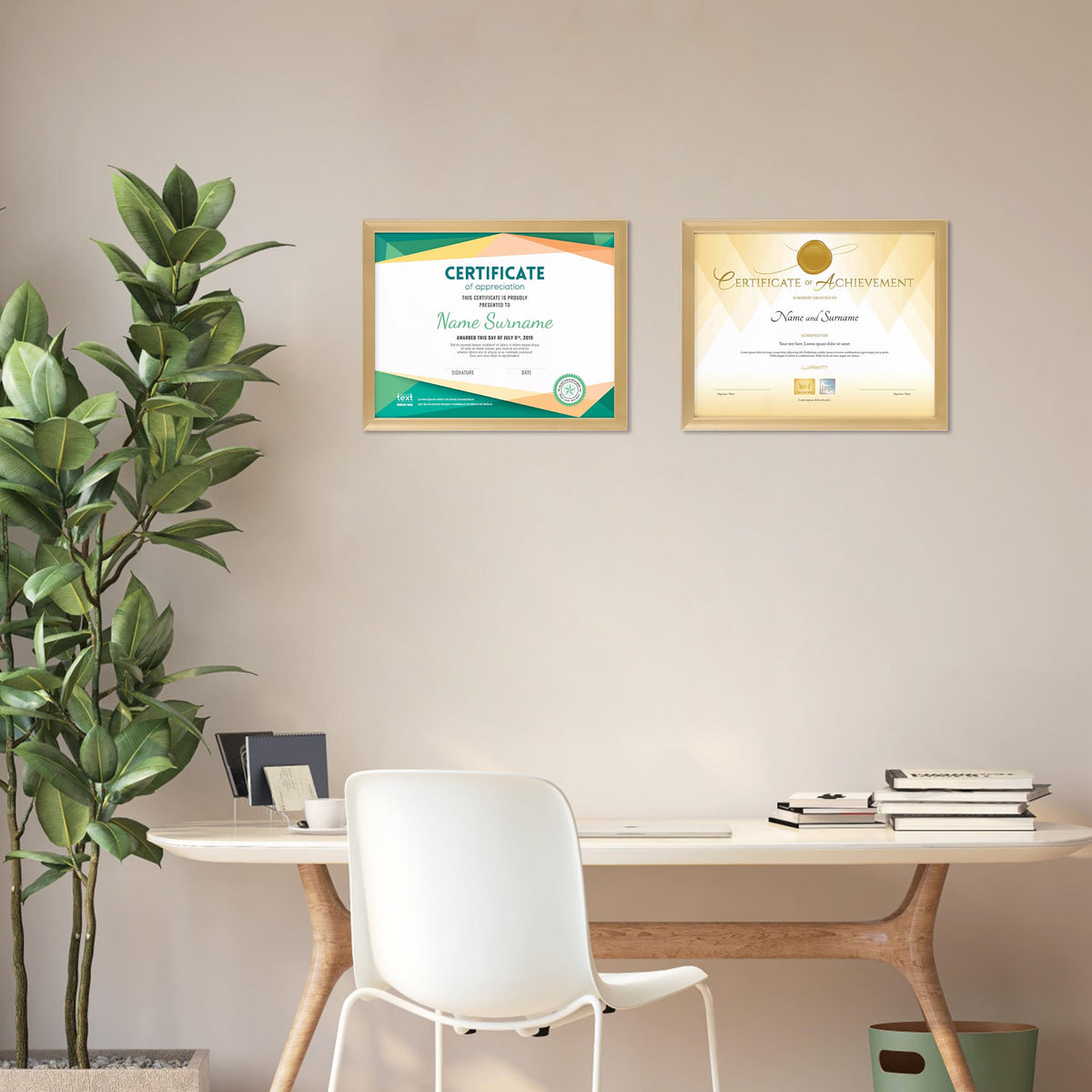 Preserve and Display with Elegance: Our set of 7 sleek Gold certificate frames are expertly crafted with PS material, offering a sophisticated way to showcase your 8.5x11 diplomas, awards, or documents. The plexglass front protects against dust and damage, ensuring your achievements remain in pristine condition. | Versatile Hanging and Tabletop Options: Whether its for your office, home, or classroom, these certificate frames provide dual-display versatility. Equipped with sturdy hooks, they can be mounted horizontally or vertically on the wall or displayed on any tabletop with the included easel back, making them perfect for any setting. | Professional Design for Every Decor: Enhance the professional appeal of your space with our certificate frames that boast a classic Gold finish, designed to complement any decor. Ideal for graduates, educators, and professionals, these frames add a touch of class to your accomplishments. | Bulk Pack for Multiple Achievements: With a multi-pack of 7 frames, you can create a gallery of success stories without the need for separate purchases. These frames are not only a testament to your hard work but also serve as a constant source of inspiration and motivation. | Gift of Inspiration: Looking for a thoughtful gift for a recent graduate or a professional? Our certificate frames are not just a gift, but a statement of confidence in their achievements. Present this set to celebrate milestones and encourage aspirations in a tangible, memorable way.