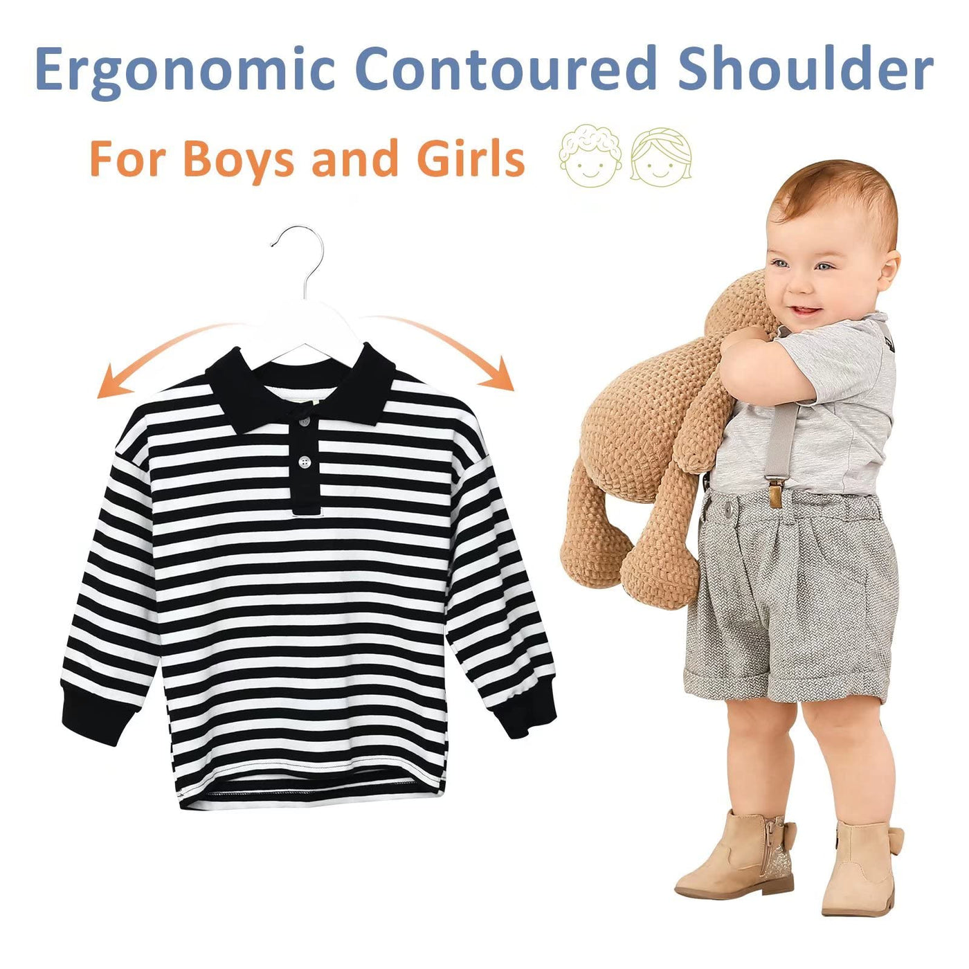 • Q: Are the hangers suitable for both girls and boys? A: Yes, these hangers are designed to accommodate both girls' and boys' clothing, making them versatile for a child's wardrobe.