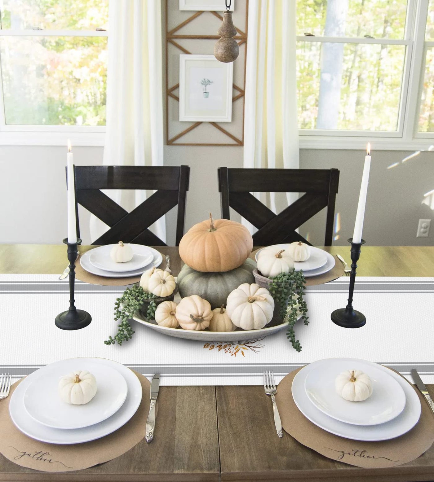 Fall Thanksgiving Table Runners 70 Inch Decorations White Pumpkin Leaf Branch Runners For Dining Tables Gray Stripes Autumn Dinn