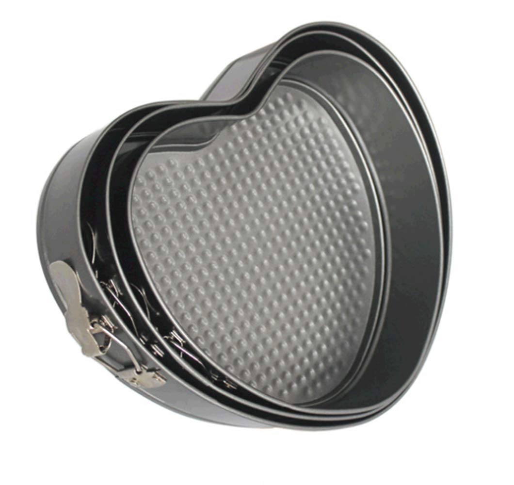 - Q: What are the dimensions of the cake molds included in the set? A: The set includes three heart-shaped cake molds with dimensions of L 11 inches, M 10.23 inches, and S 9.44 inches, all with a height of 2.56 inches.