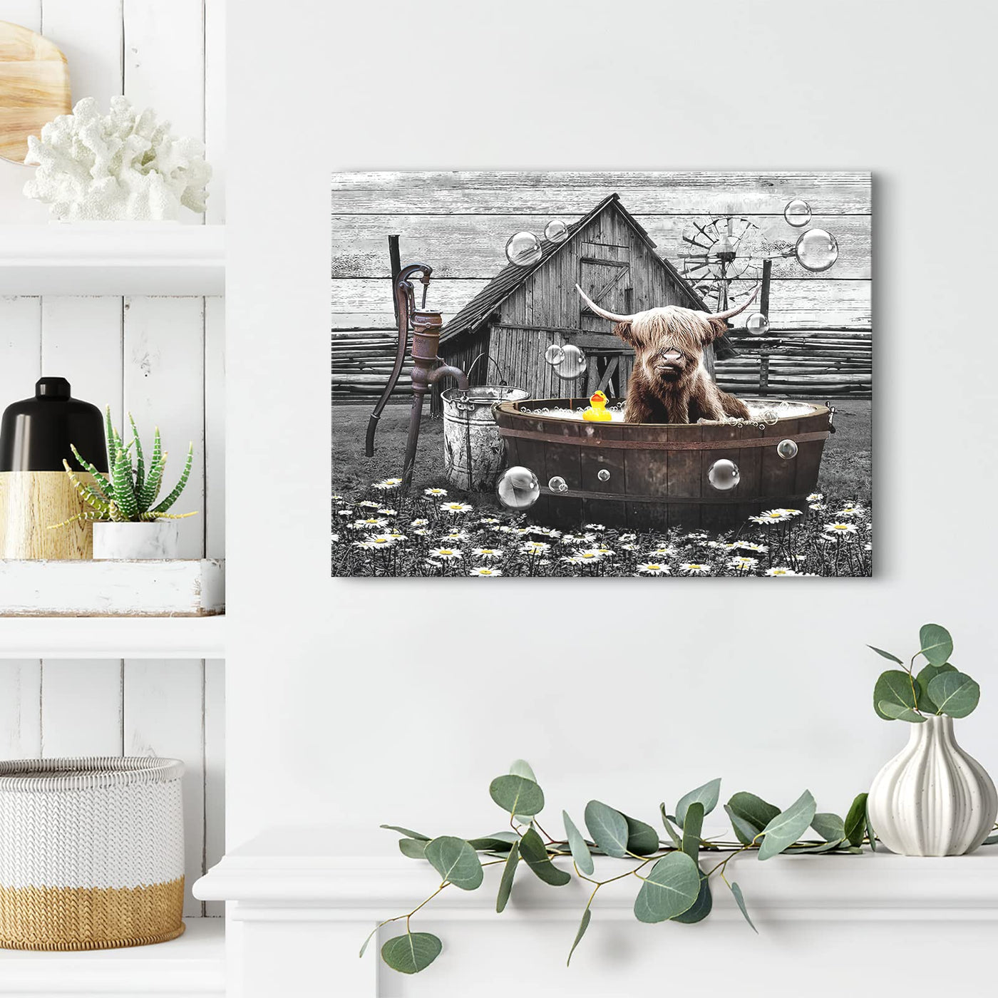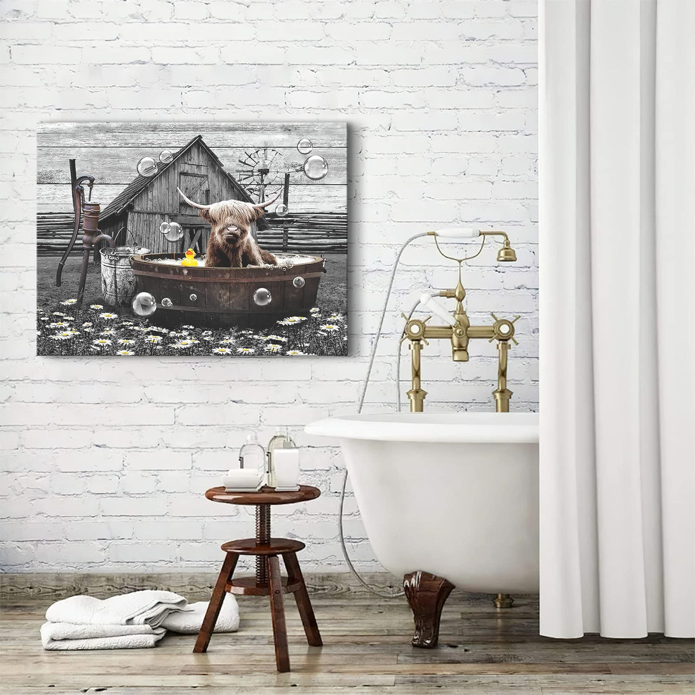 Farmhouse Bathroom Decor Wall Art Funny Highland Cow In Bathtub Pictures Wall Decor Rustic Bathroom Cow Painting For Bathroom To