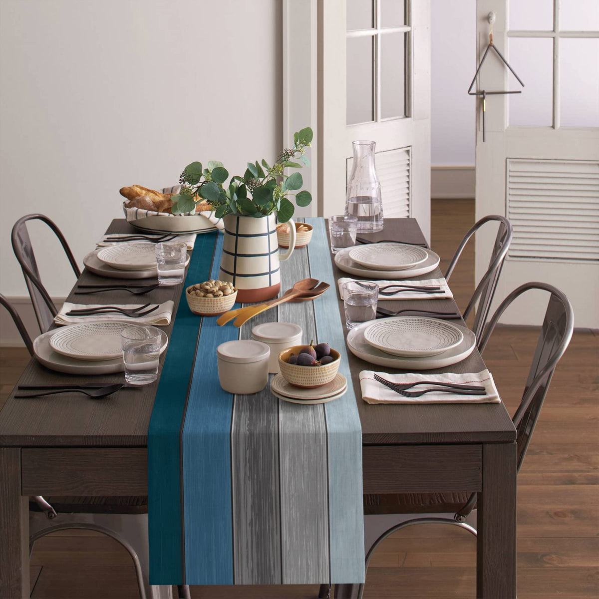 - Q: How does the design of the table runner enhance my table setting? A: The retro rustic barn wood texture and ombre blue-gray ocean hues of the table runner add an elegant and stylish touch to your table setting.