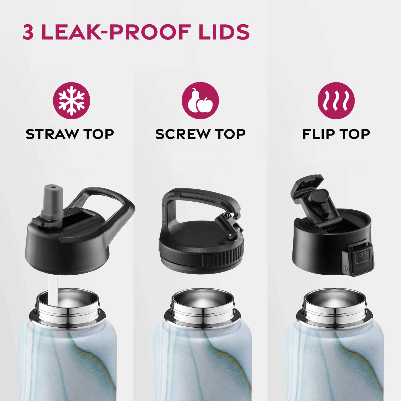 - Q: What types of lids are included with the FineDine water bottle? A: The FineDine water bottle comes with three versatile lids: one with a mouthpiece for hot drinks, one with a straw for cold beverages, and a removable lid for drinks containing ice or fruit.