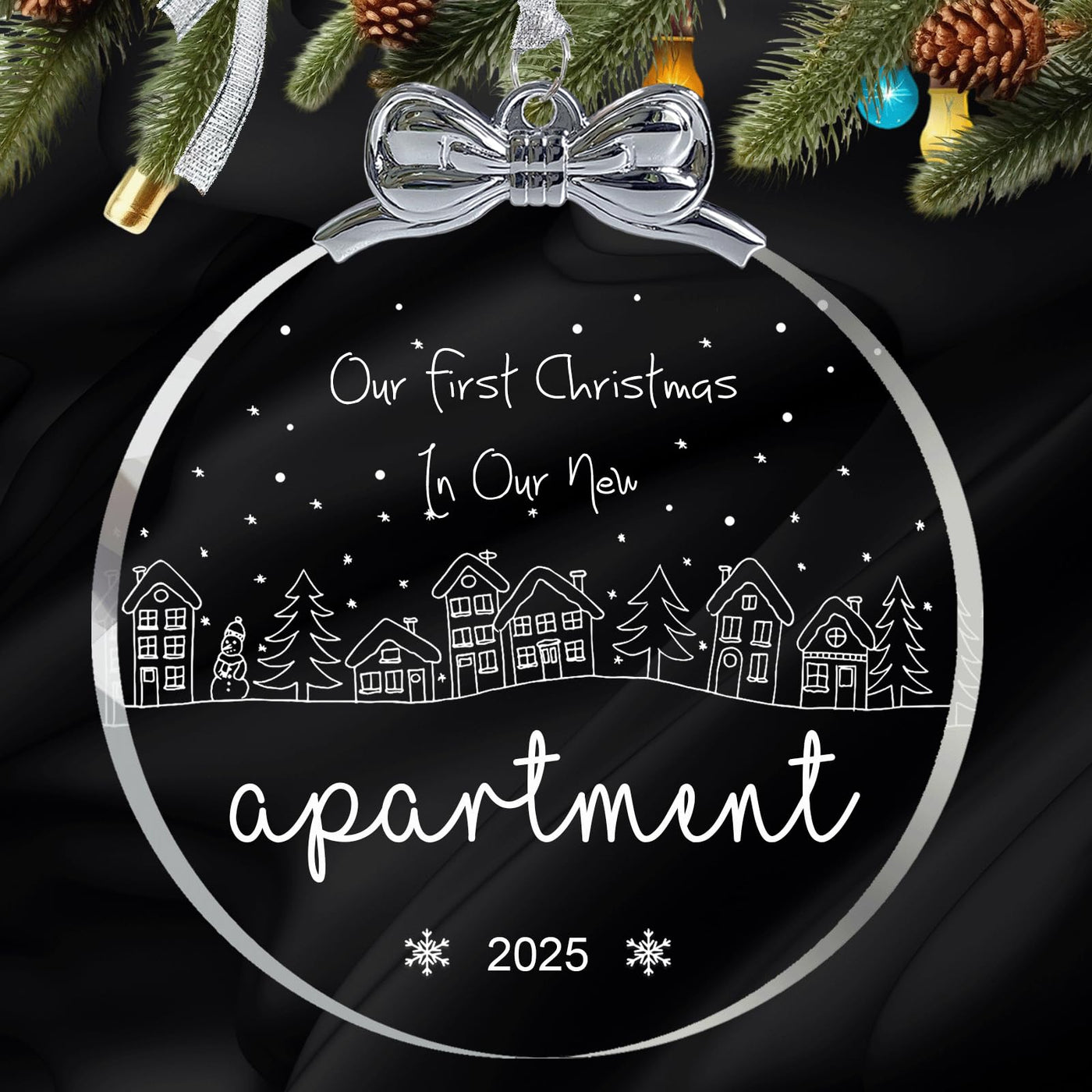 ???New Apartment Gifts 2025?The crystal glass paired with a silver metal bow and a silver ribbon, cute, exquisite and unique design. It can be the highlight of your gift basket or hung on the Christmas tree of the new house owner. Specially designed for gift-giving, it will bring a surprise and smile to the face of receiver and giver. | ???Crystal Material?Made of crystal glass (not acrylic or plastic), transparent high hardness, smooth edges, better gloss and texture. The bowknot part is made of metal, the metal surface is polished and plated, makes the ornament exquisite and cute. The whole metal part sparkles and has a unique metallic texture. Beautiful, unique, durable and collectible. | ???Unique Design?Snowflakes are dancing all over the sky. The pattern design of the apartment, tree and snowman, accompanied by warm words, specific year: our first christmas in our new apartment 2025. A housewarming gift to celebrate this special moment for the new homeowner and say congratulations. | ???What Will You Get ??1x 3 * 3.5 crystal glass new apartment ornament 2025; 1x Best wishes greeting black gift box; 1x silver ribbon hanging cord. Specially designed for gift-giving to your lover, families, friends, neighbors etc.. | ???Hanging Xmas Ornaments 2025?The Ornament is including a silver ribbon hanging cord to easily hang on your Christmas tree. Vivid color and unique design, perfect for hanging on the tree, window, wall or anywhere you want.
