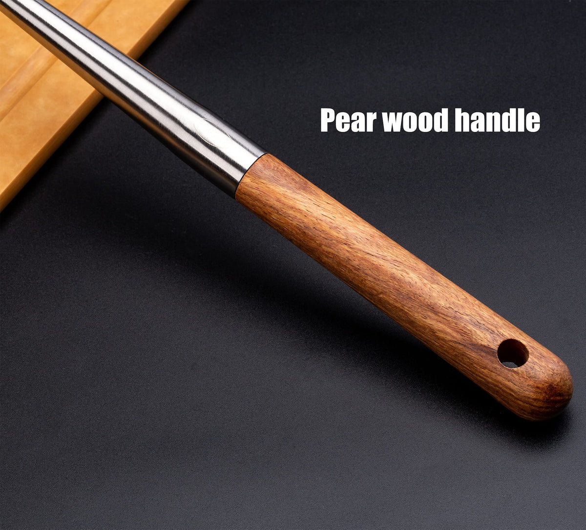 • Q: What are the advantages of the ergonomic wooden handle? A: The ergonomic wooden handle provides a comfortable grip and helps prevent burns while cooking.