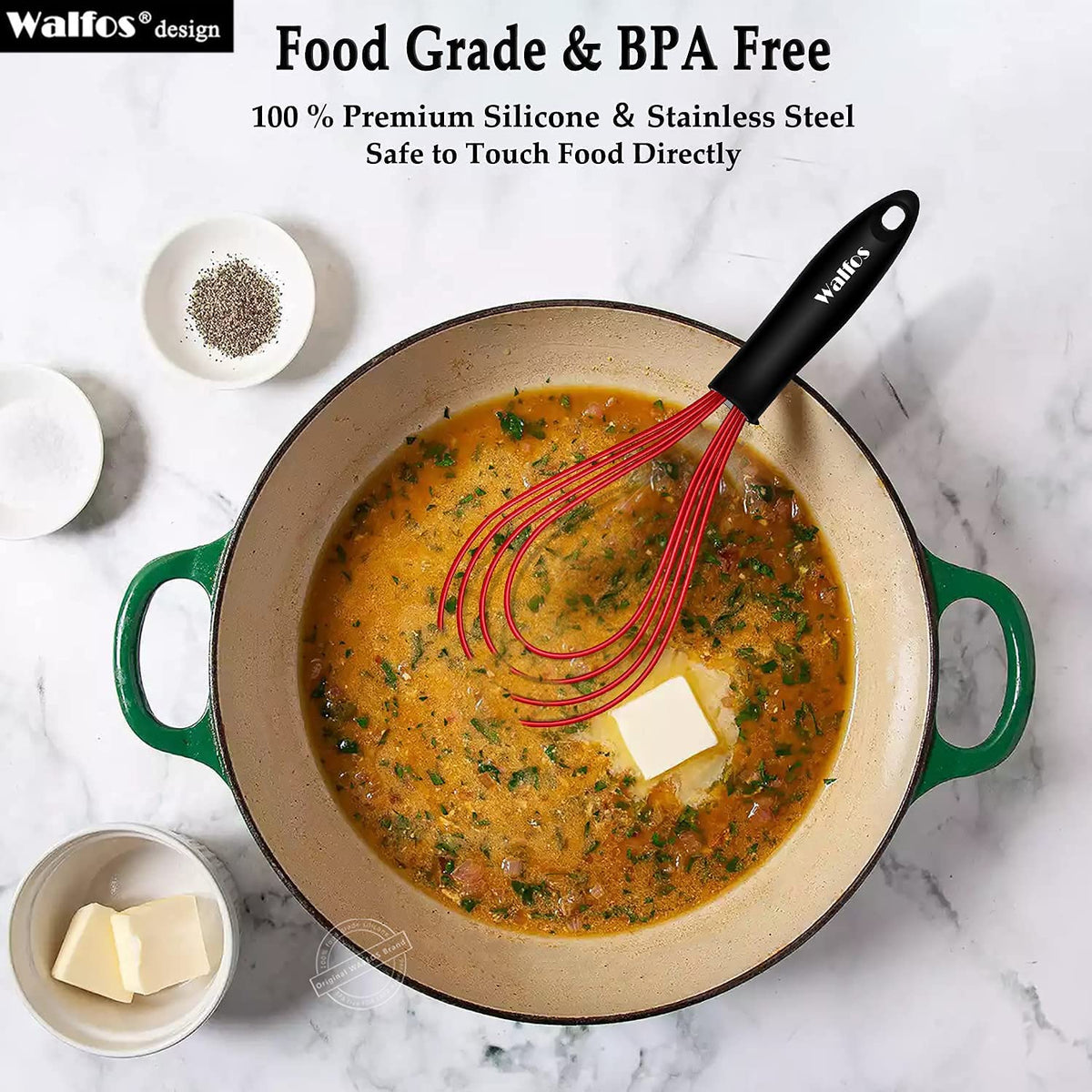 - Q: Can I use the Walfos Flat Whisk for beating eggs? A: Yes, the Walfos Flat Silicone Whisk is perfect for blending, beating, and stirring, including small quantities of eggs in pots or bowls.
