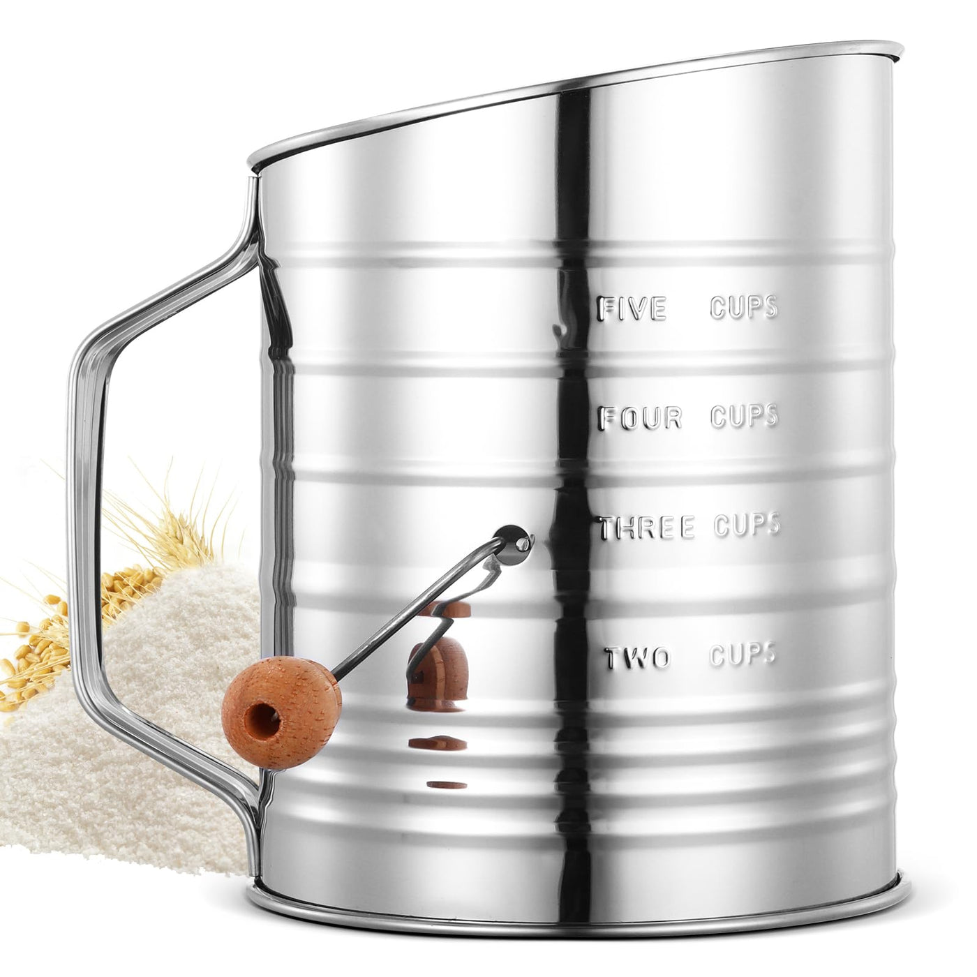 • Q: Does the Flour Sifter have any special features? A: Yes, it features a hand crank design for smooth operation, a fine mesh sieve for even flour distribution, and engraved measurement marks for easy use.