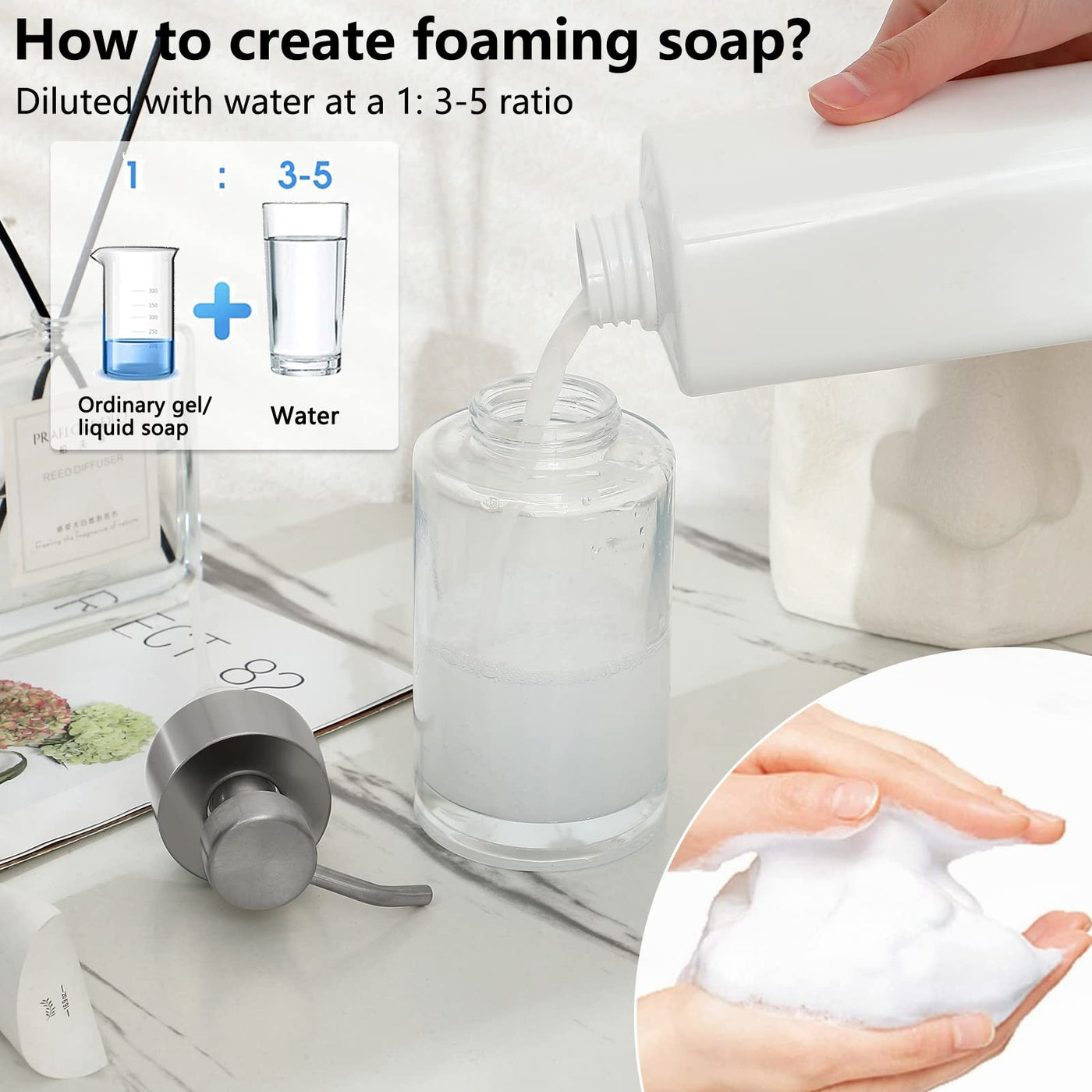 Foaming Soap Dispenser Set 17 Oz Clear Glass Hand Soap Dispenser with 304 Rust Proof Stainless Steel Pump Waterproof Labels for Bathroom Decor Kitchen College Dorm