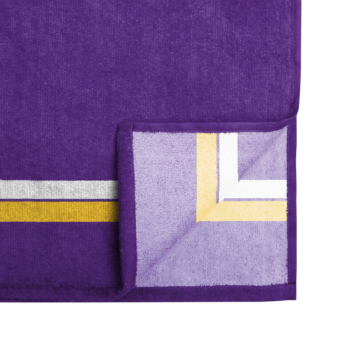 • Q: What is the design of the towel? A: The towel features an all-over team-colored design, prominently displaying the Minnesota Vikings logo and wordmark team name.