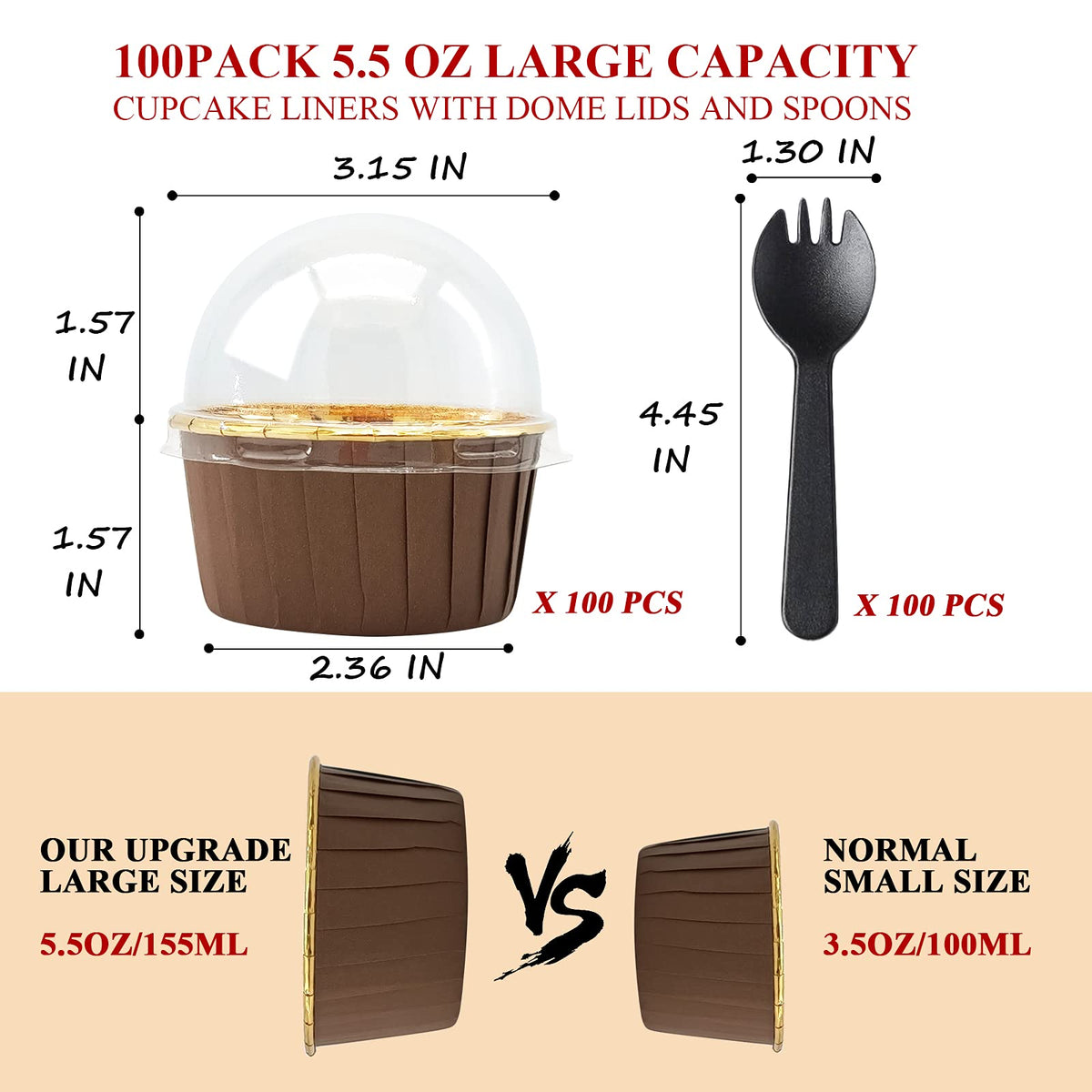 - Q: What is included in the package? A: The package includes 100 cupcake liners, 100 matching dome lids, and 100 individually wrapped spoons.