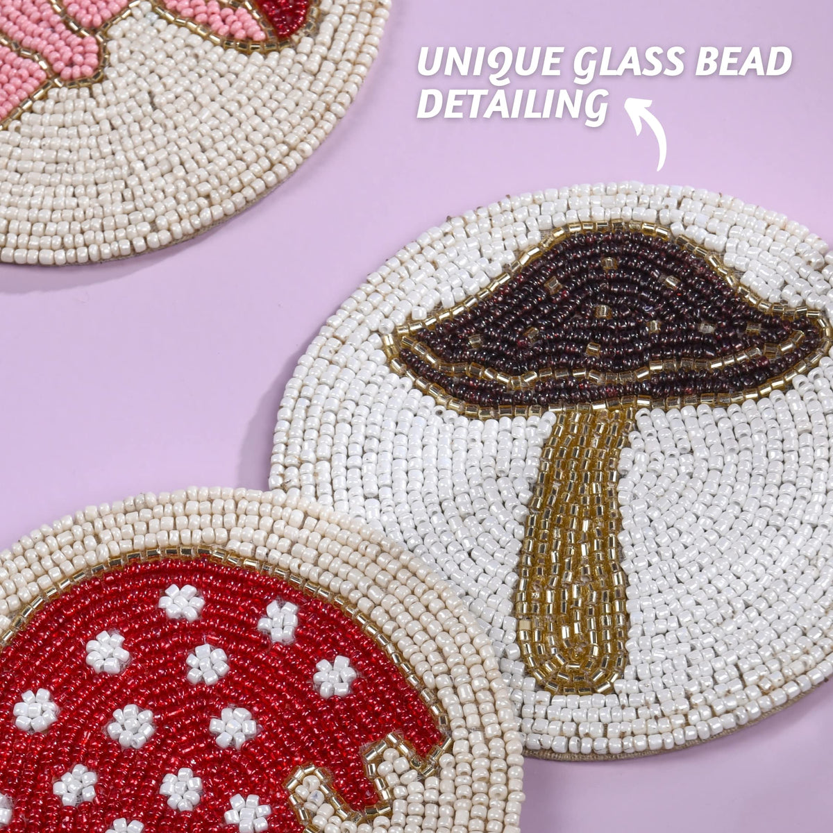 - Q: What design motifs are featured on the coasters? A: The coasters feature beautiful boho motifs, including mushrooms and other intricate designs, surrounded by shiny white toned beads.