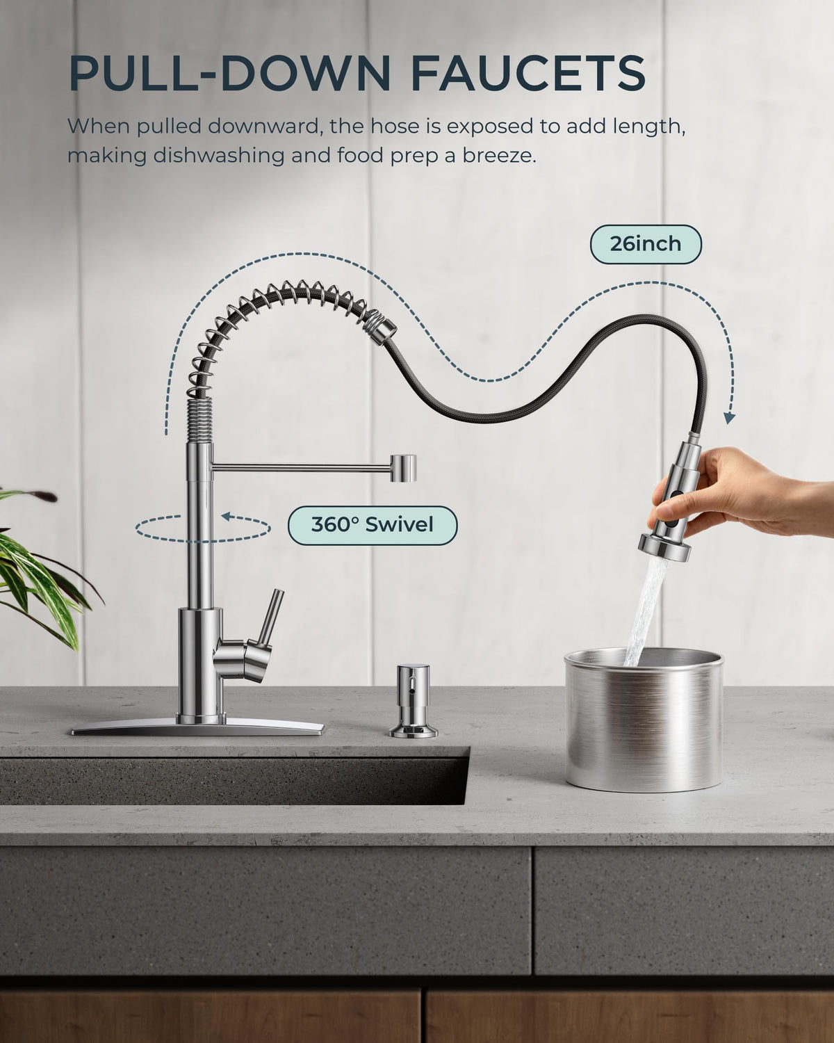 - Q: How does the pull-down sprayer work? A: The pull-down sprayer features two spray settings: stream and spray. You can easily switch between them to fill pots or rinse dishes.