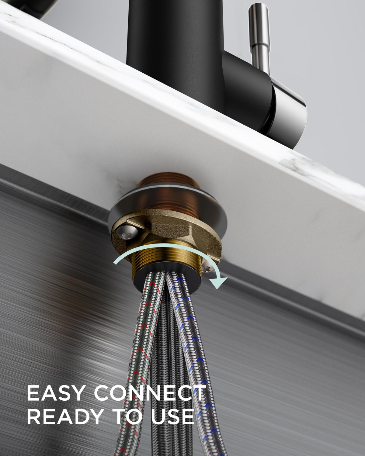 - Q: How does the pull-down sprayer work? A: The pull-down sprayer allows you to easily switch between two water settings: stream and spray, making it convenient for various kitchen tasks.