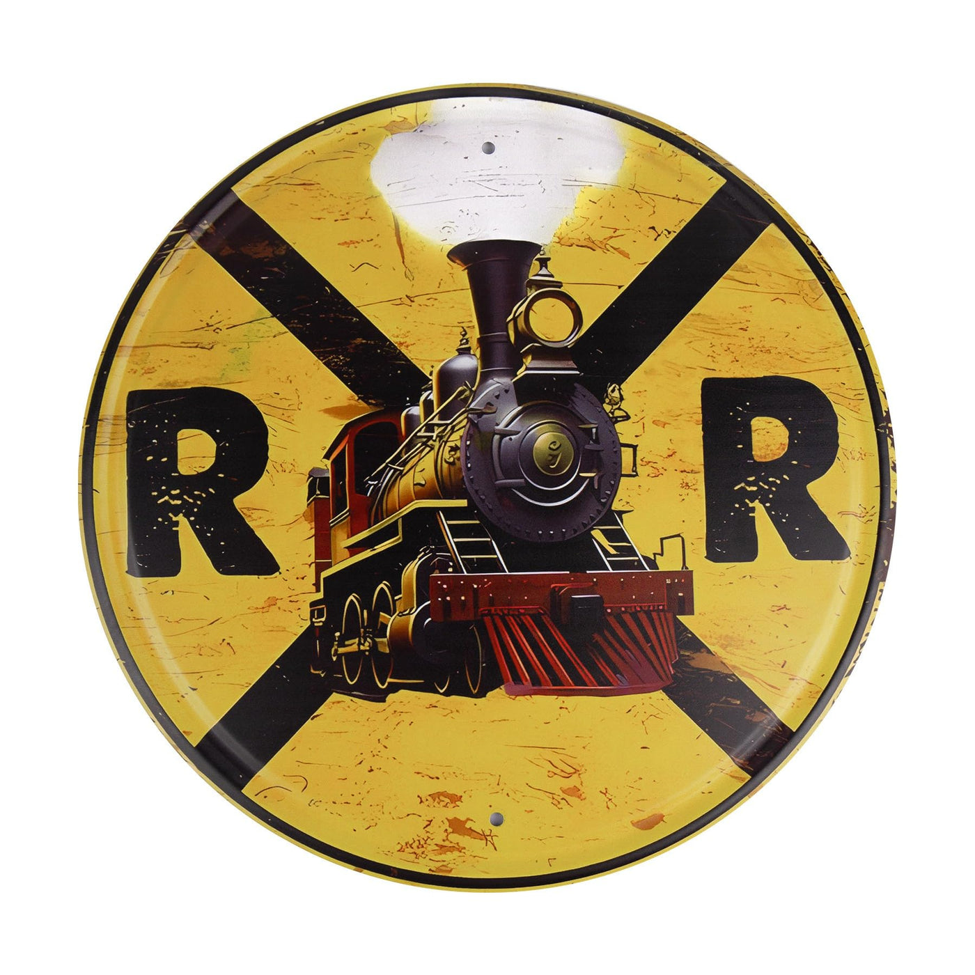FeatureWhether it s your living room, cafe or dining room, railroad crossing signs can give your space a retro and industrial look.SpecificationsSize: 12 inches in diameterColor: YellowMaterial: MetalQuantity: 1pcNotePlease allow a little error on the size due to manual measurement.
