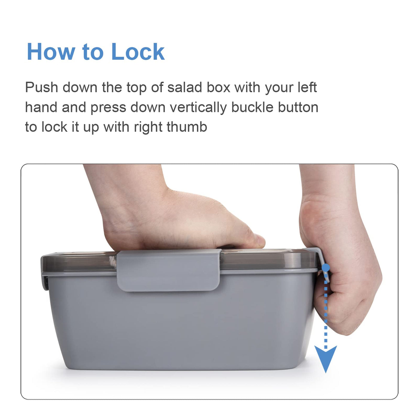 • Q: Is the salad container leak-proof? A: Yes, the salad container features a leak-proof design with tight locks that seal more securely than those with rubber rims, ensuring your food stays contained.