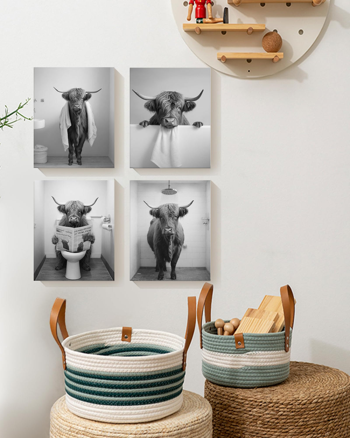 - Q: What are the dimensions of the Funny Highland Cow Bathroom Wall Art? A: The dimensions of each piece in the set are 12 inches by 16 inches, and the set includes a total of four pieces.