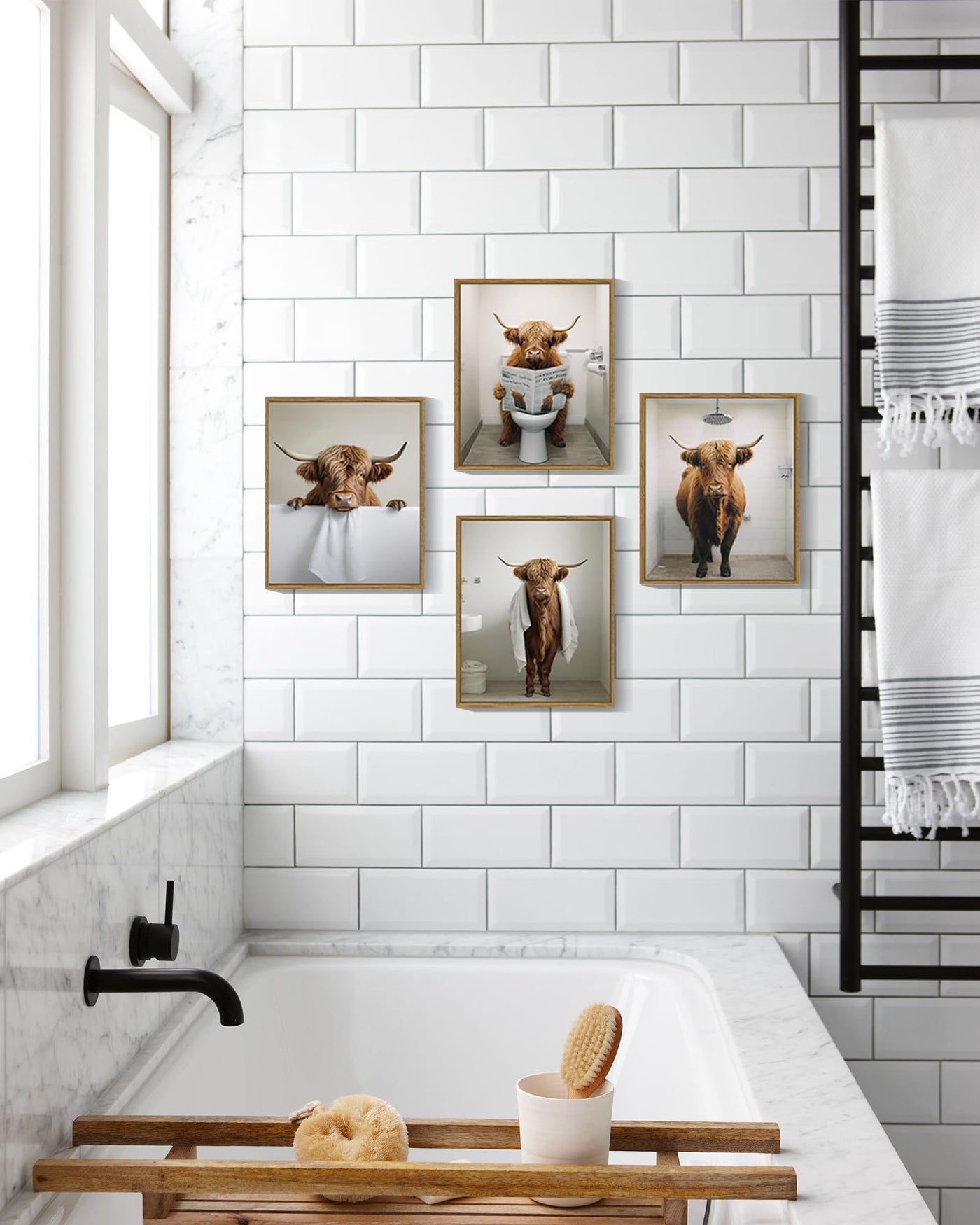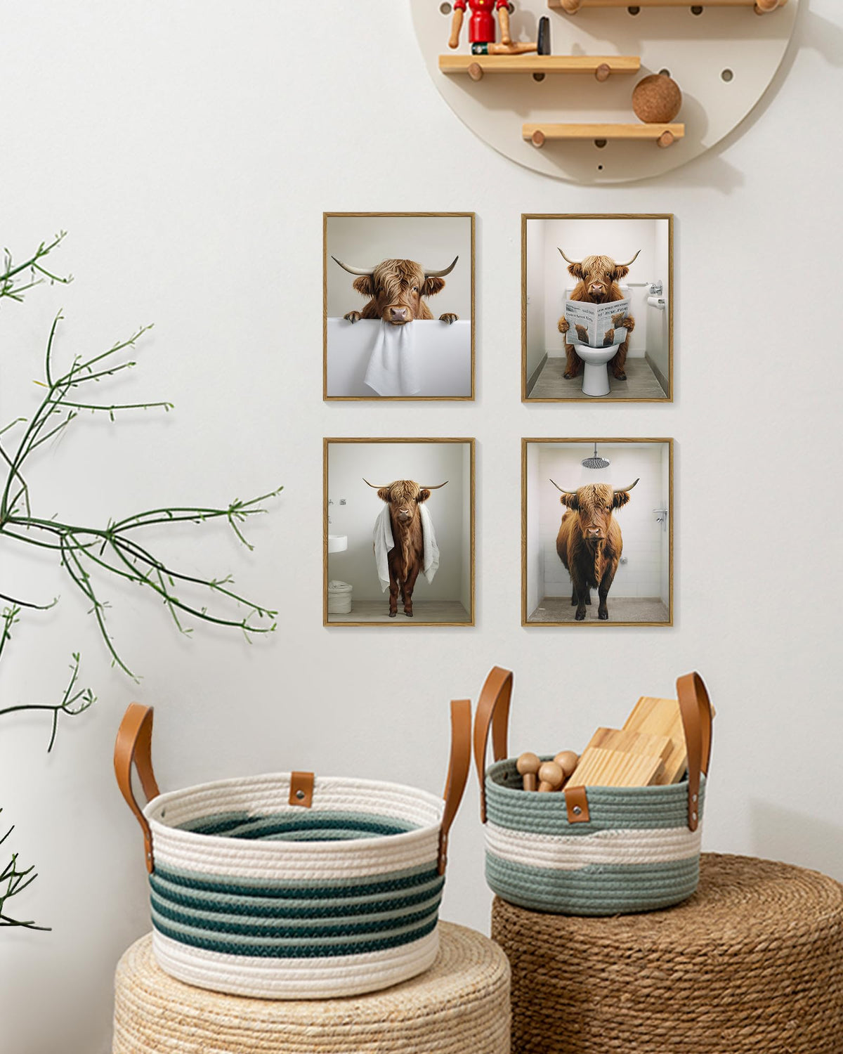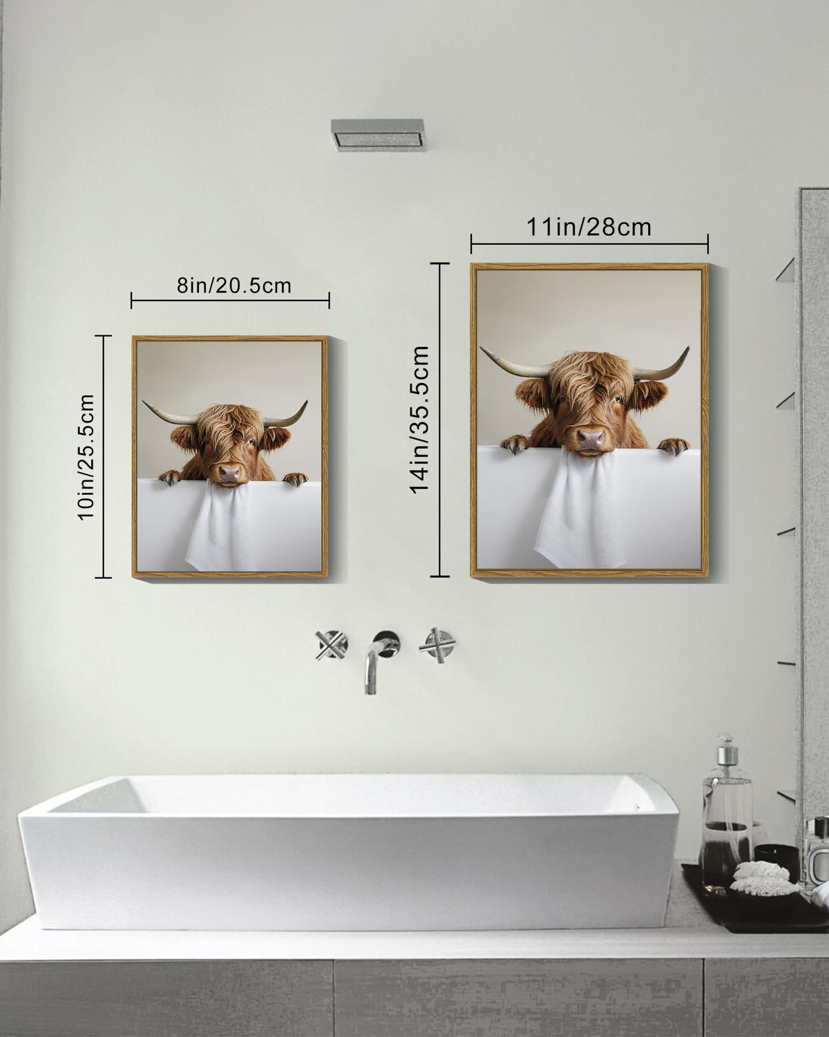 - Q: Can this wall art be used in places other than the bathroom? A: While it is designed for bathroom decor, the humorous style of the Highland Cow art can also enhance any other room in your home.