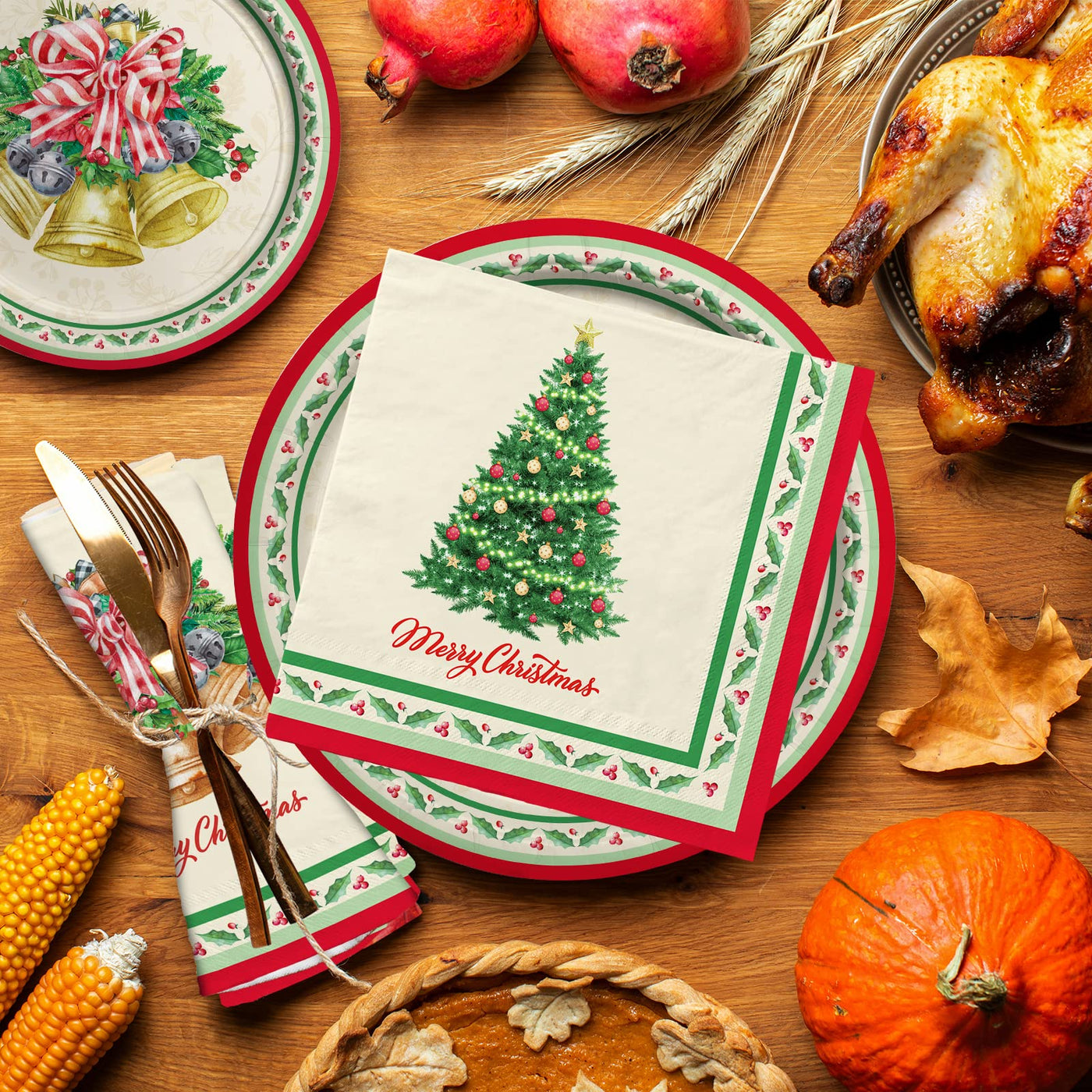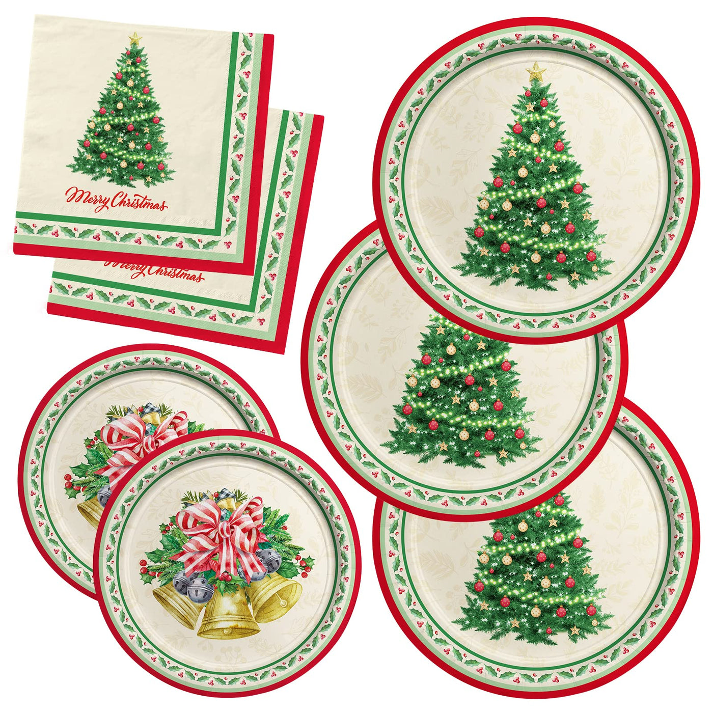 Gatherfun Christmas Party Supplies Kit, Serve 50, Christmas Tree Disposable Dinnerware Includes: Paper Dinner Plates, Dessert Pl