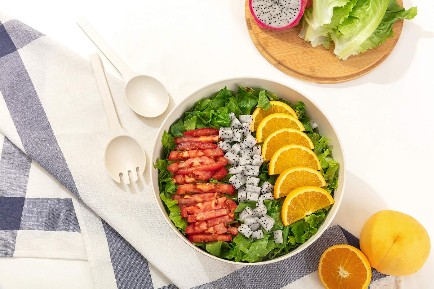 - Q: Does the salad bowl come with utensils? A: Yes, the set includes a serving spoon, a server spork, and a natural bamboo lid that also functions as a cutting board.