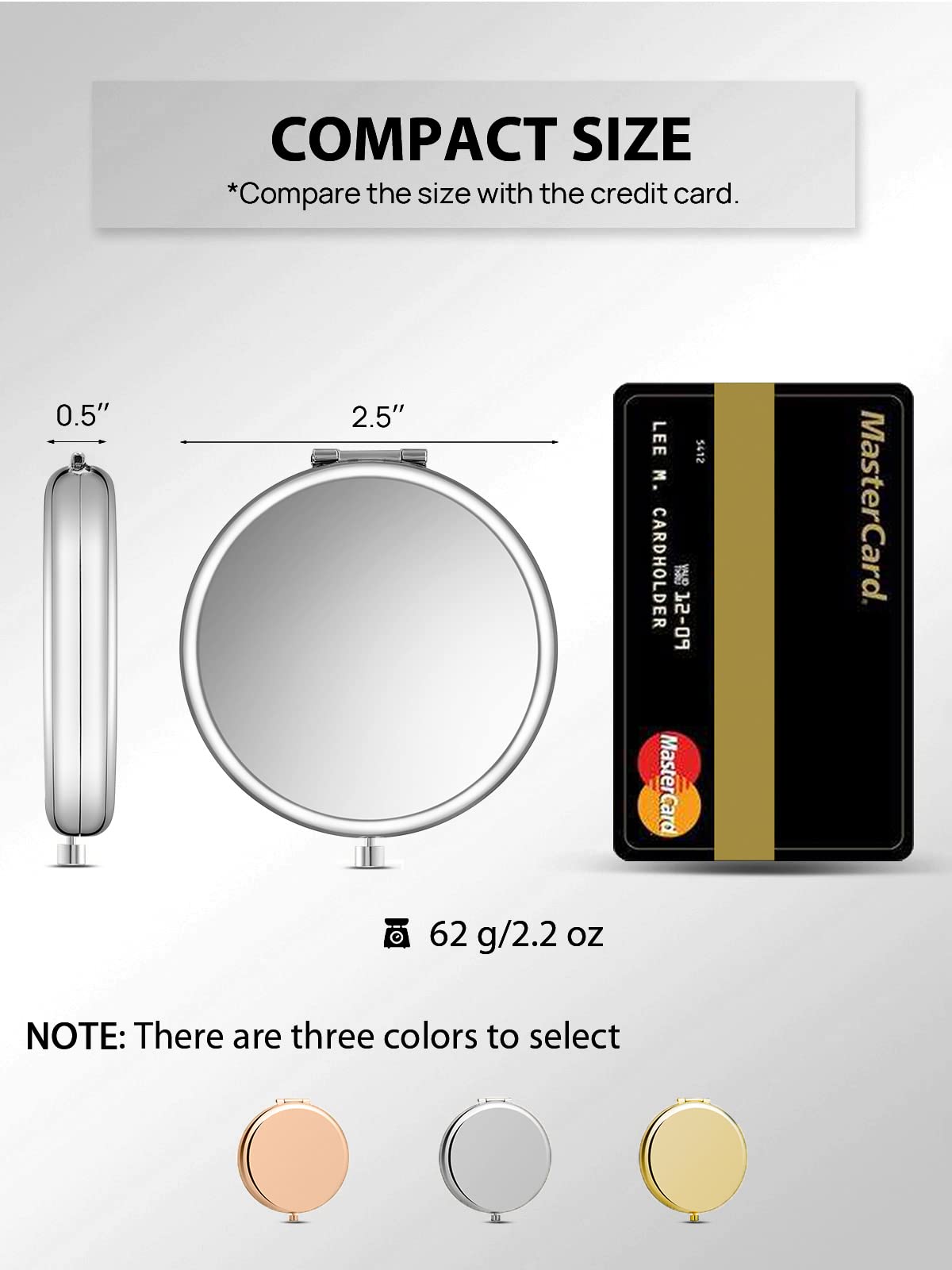 - Q: What colors are available for the compact mirror? A: The compact mirror is available in three colors: Gold, Rose Gold, and Silver.